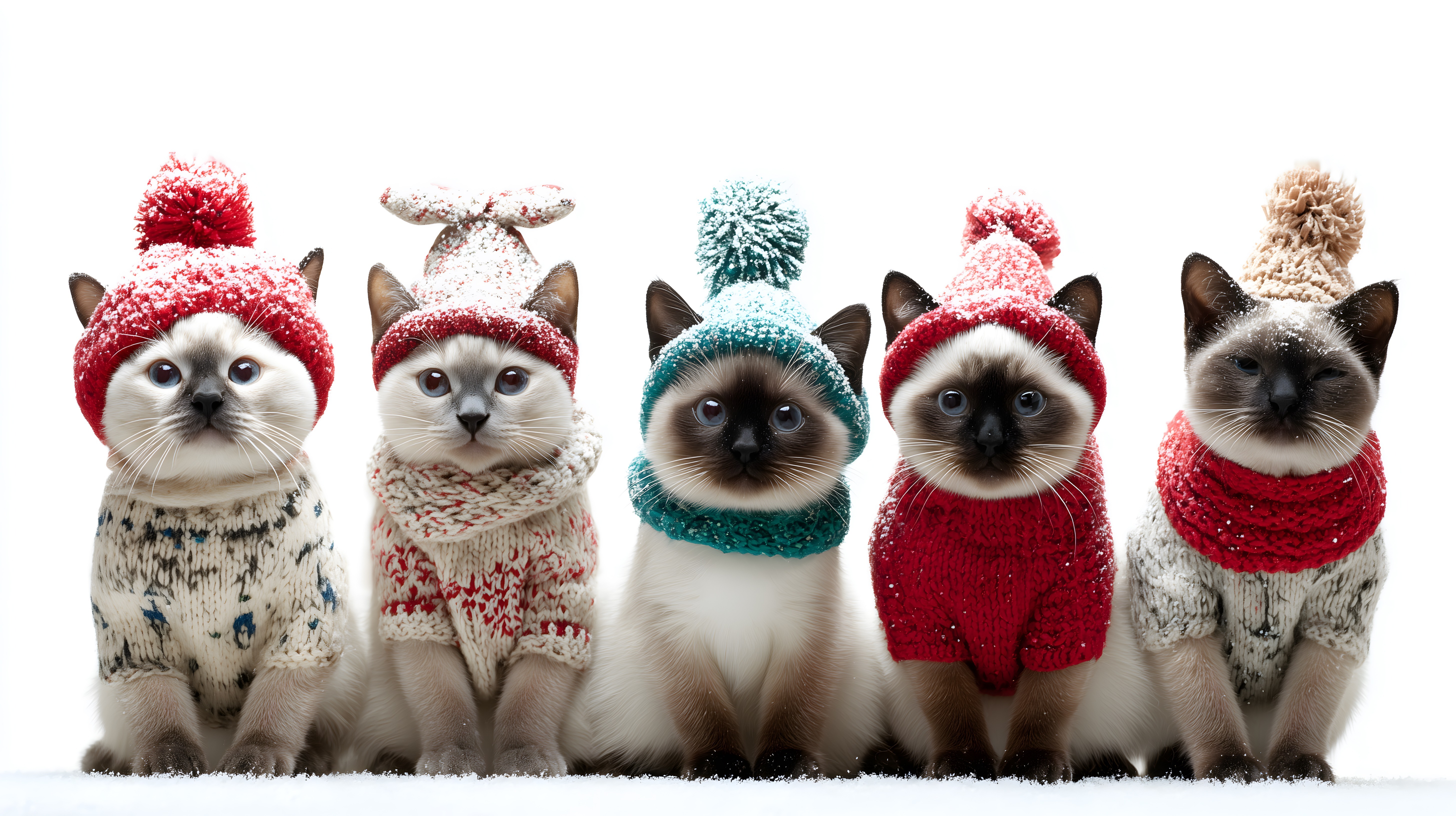 Dieses entzückende Foto zeigt fünf Katzen, die in liebevoll gestrickten Pullovern, Mützen und Schals posieren. Die Tiere sitzen in einer Reihe vor einem weißen Hintergrund, sodass ihr winterliches Outfit und ihre detailreichen Gesichtsausdrücke perfekt zur Geltung kommen. Die Farbpalette reicht von rot über blau und weiß bis hin zu beigen Tönen, was dem Bild eine festliche und harmonische Stimmung verleiht. Dieses kostenlose Stockfoto in hoher Auflösung eignet sich hervorragend für den Einsatz in Blogs, Newslettern, Social-Media-Beiträgen oder Werbematerialien rund um die Themen Haustiere, Weihnachten und Winterdekorationen. Die Katzen sind unter der Creative-Commons-Lizenz nutzbar.