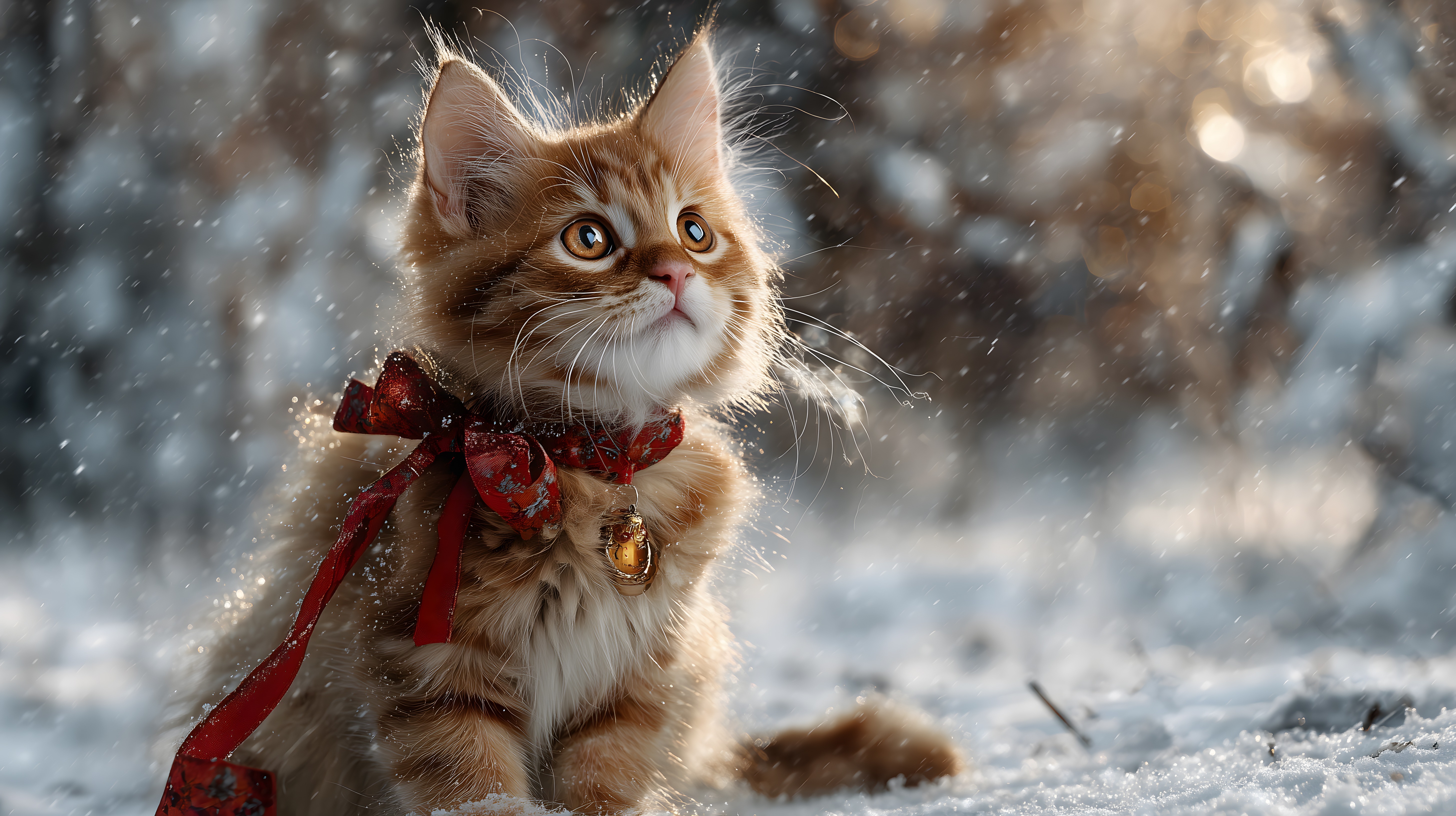 Das Bild zeigt ein entzückendes Kätzchen, das inmitten einer winterlichen Landschaft mit Schneefall sitzt. Das Kätzchen trägt eine rote, festliche Schleife um den Hals und blickt mit großen, neugierigen Augen in die Kamera. Die Szene vermittelt eine wunderbare, winterliche Stimmung und weckt Gefühle von Gemütlichkeit und Weihnachtsfreude. Dieses hochauflösende Stockfoto eignet sich hervorragend für die Verwendung in Blogs, Newslettern, auf Social Media-Kanälen oder für Werbezwecke rund um die Feiertage und das Winterthema. Es steht unter einer kostenlosen Creative Commons-Lizenz zur Verfügung.