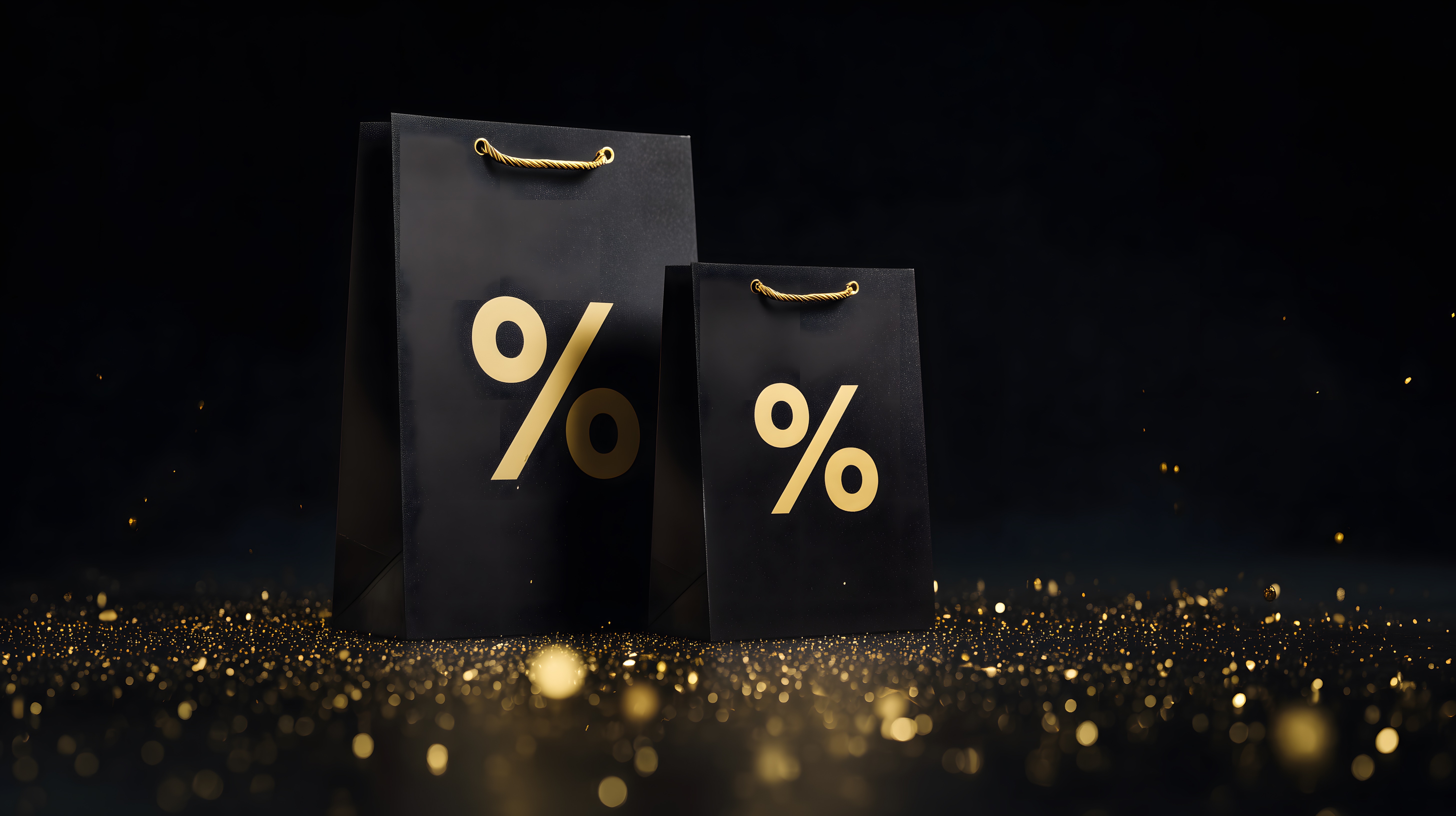 Dieses Bild zeigt zwei schwarze Einkaufstüten mit goldenen Prozentzeichen darauf, die vor einem schwarzen Hintergrund mit goldenen Lichtern stehen. Die Taschen symbolisieren attraktive Rabatte und Sonderangebote, wie sie beispielsweise bei Online-Verkäufen oder saisonalen Ausverkäufen zu finden sind. Das Foto kann für Werbung, Blogs, Newsletter oder Social-Media-Beiträge rund um Themen wie Verkauf, Rabatte und Sonderangebote verwendet werden. Es ist ein hochwertiges, kostenloses Stockfoto, das unter einer Creative-Commons-Lizenz zur Verfügung steht und in hoher Auflösung heruntergeladen werden kann.