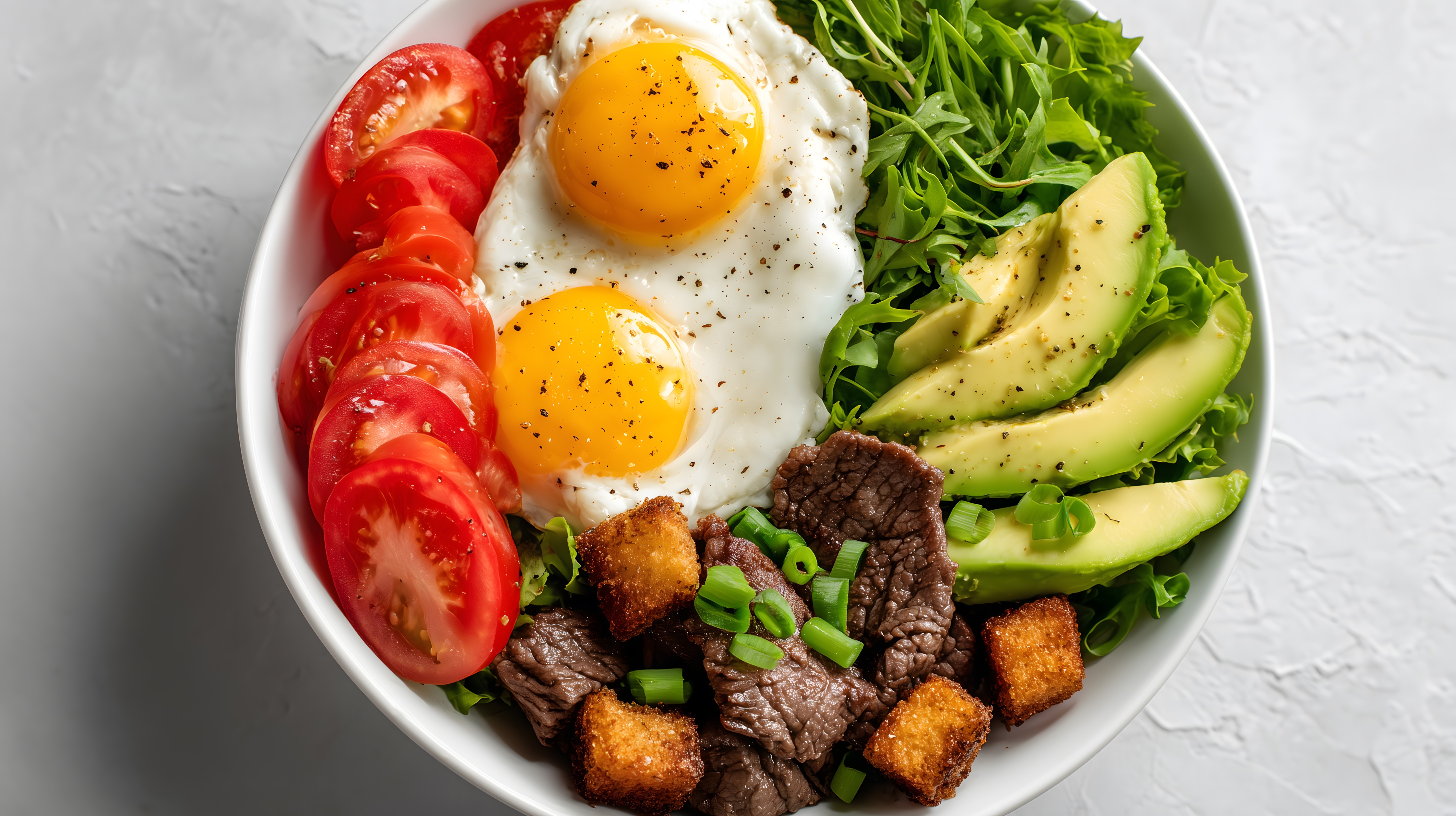 Dieses attraktive Fotomotiv zeigt einen appetitlichen Salatteller, der eine ausgewogene und nahrhafteFrühstücks- oder Mittagsmahlzeit repräsentiert. Im Zentrum befinden sich zwei knusprig gebratene Spiegeleier, umgeben von frischen Tomaten, Avocadostücken und grünem Blattsalat. Die Zutaten sind in einer weißen, einfachen Schüssel auf einem hellen Untergrund angeordnet, was den rustikalen, modernen Charakter des Fotos unterstreicht. Dieses hochauflösende Stockfoto ist ideal für den Einsatz in Blogbeiträgen, Newslettern, Social-Media-Kanälen oder Werbematerialien zum Thema gesunde Ernährung, Frühstücksrezepte oder Lebensmittelfotografie. Es steht unter der Creative-Commons-Lizenz zur kostenlosen Verwendung zur Verfügung.
