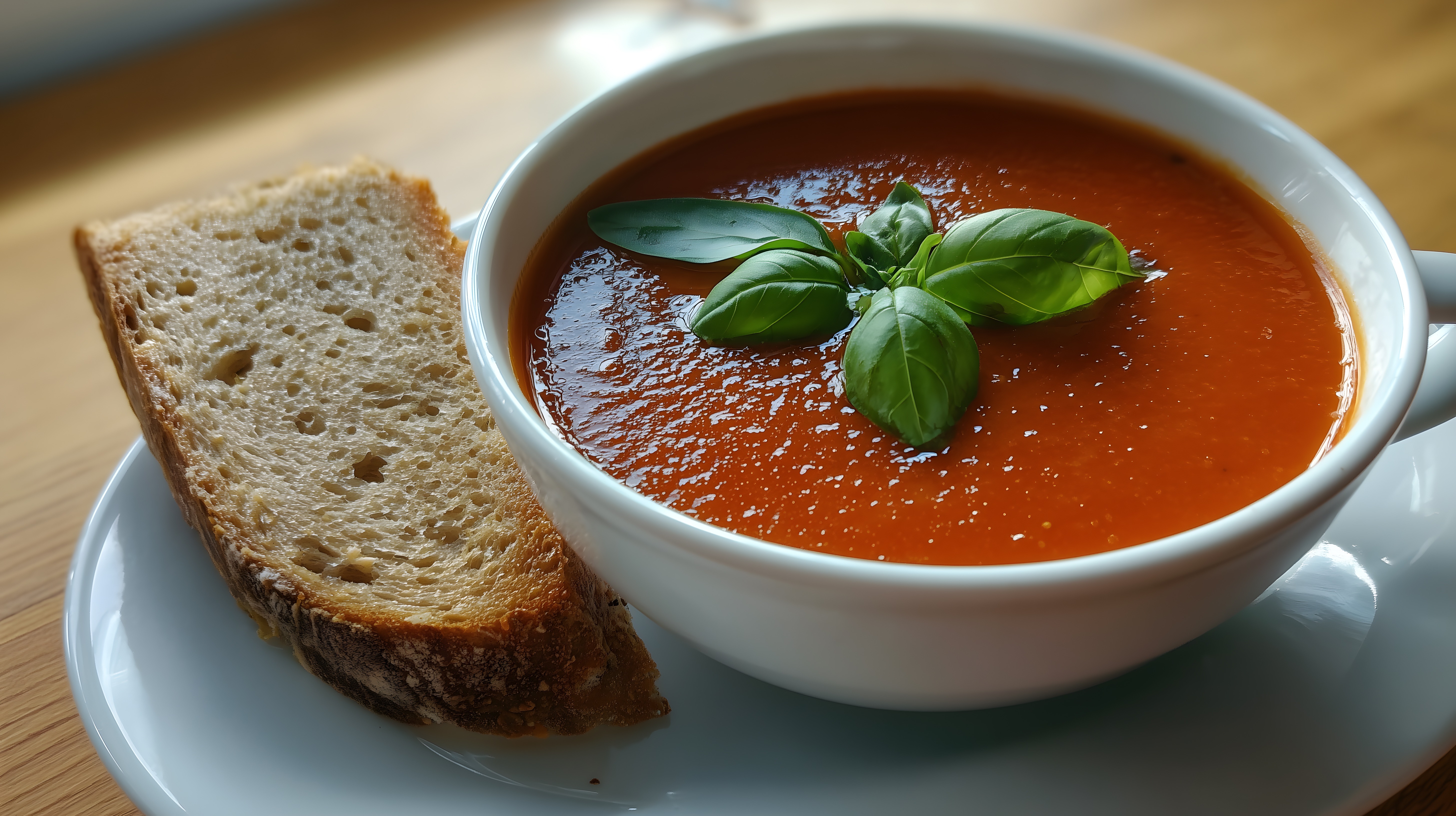 Das Bild zeigt eine Schale mit einer dampfenden, orangefarbenen Tomatensuppe. Die Suppe ist garniert mit frischen, grünen Basilikumblättern, die einen schönen farblichen Kontrast bilden. Auf der Seite liegt ein Stück rustikal aussehenden Brottoasts, perfekt zum Eintauchen in die Suppe. Der Holztisch im Hintergrund verleiht der Szene eine gemütliche, natürliche Atmosphäre. Diese traditionelle Tomatensuppe eignet sich perfekt als Hauptgericht für ein gesundes Mittagessen oder als Teil eines leckeren Abendessens. Das hochauflösende Foto im kostenlosen Creative-Commons-Stil ist ideal für die Verwendung in Blogs, Newslettern, Social-Media-Beiträgen oder Werbeanzeigen für Kochrezepte, Restaurantmenüs oder andere kulinarische Themen.