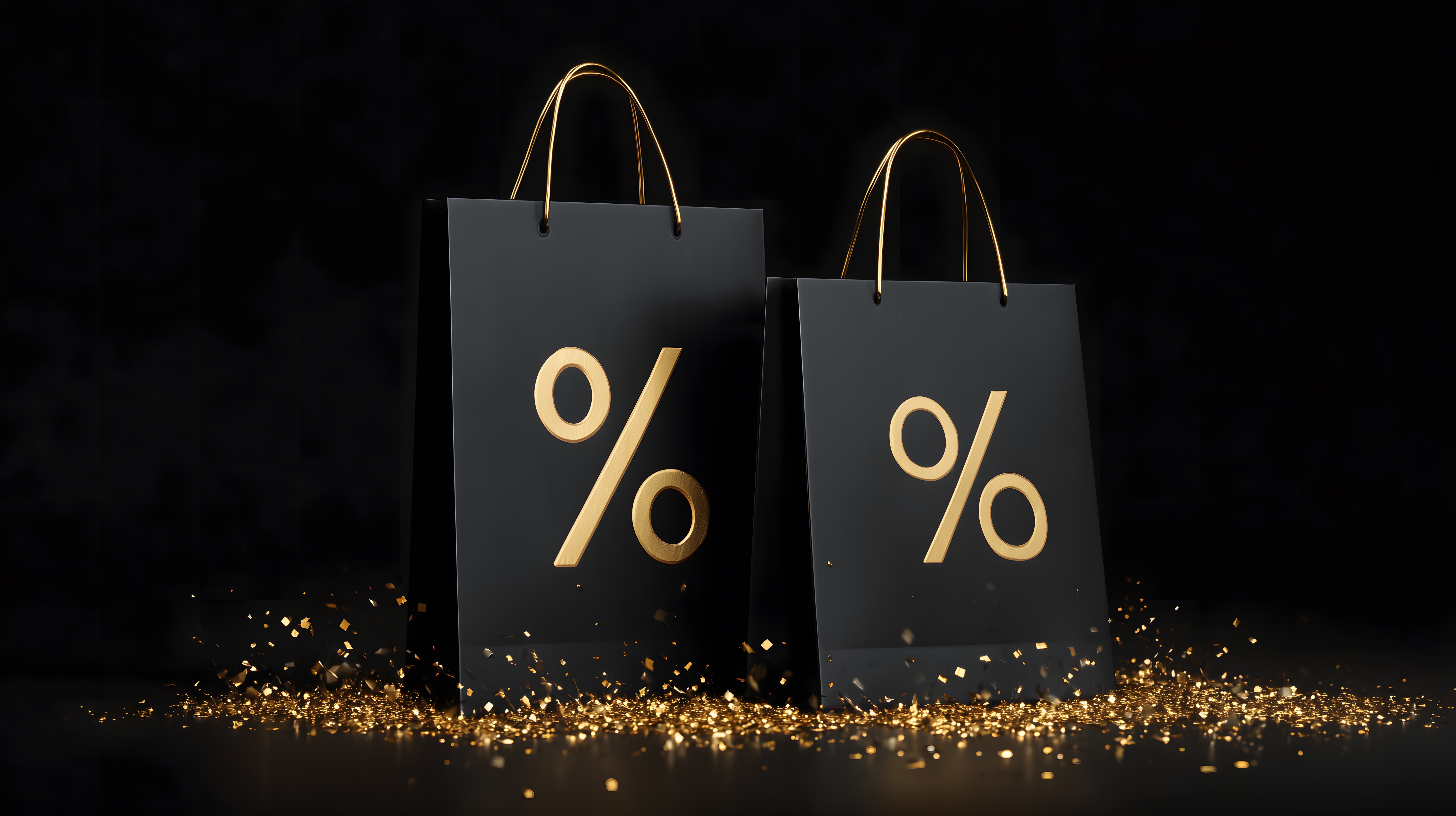 Das Bild zeigt zwei schwarze Einkaufstaschen mit goldfarbenen Prozentzeichen-Motiven auf einem dunklen Hintergrund. Die Taschen sind in einer minimalistischen Produktpräsentation angeordnet, umgeben von goldenem Glitzer. Dieses Stockfoto eignet sich perfekt für die Verwendung in Werbe- und Marketing-Materialien wie Blogbeiträge, Newsletter oder Social-Media-Posts rund um Rabatt-Aktionen, Verkäufe und Angebote. Das hochauflösende und kostenlose Foto ist unter einer Creative-Commons-Lizenz verfügbar.