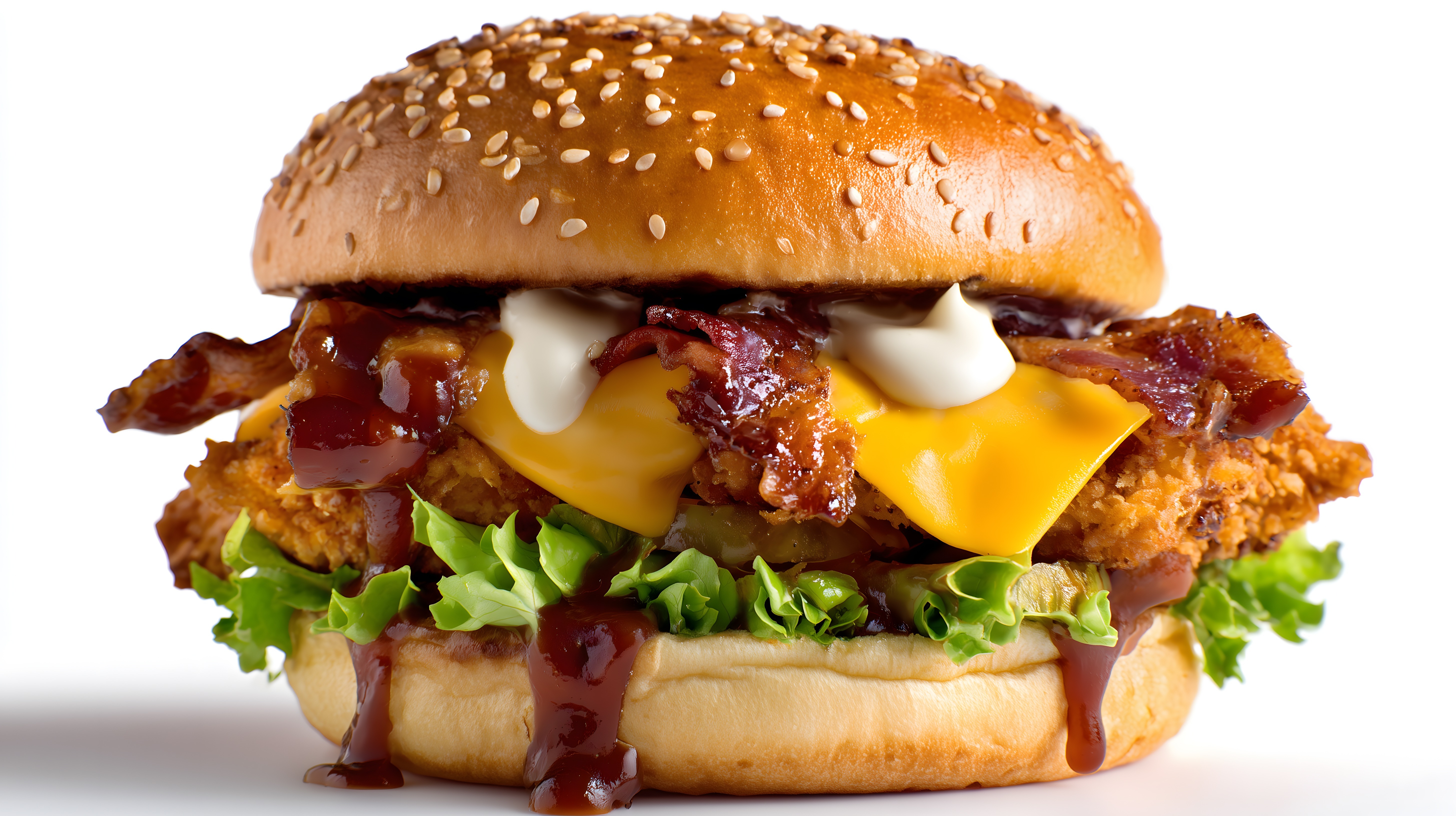 Das Foto zeigt einen leckeren, frisch zubereiteten Burger. Der Burger hat ein goldbraun gebackenes, sesam-bestreutes Brötchen als Basis. Darauf sind mehrere Zutaten aufgeschichtet: eine Scheibe geschmolzener Käse, knuspriger Speck, grüner Salat und eine BBQ-Sauce. Insgesamt ergibt sich ein appetitanregender, überfließender Anblick des saftigen Fastfood-Klassikers. Dieses Stockfoto in hoher Auflösung eignet sich hervorragend für Verwendungen in Blogs, Newslettern oder Werbekampagnen rund um das Thema Burger, Fastfood oder Grillsaison. Das Bild steht unter der Creative-Commons-Lizenz zur kostenlosen Verwendung zur Verfügung.