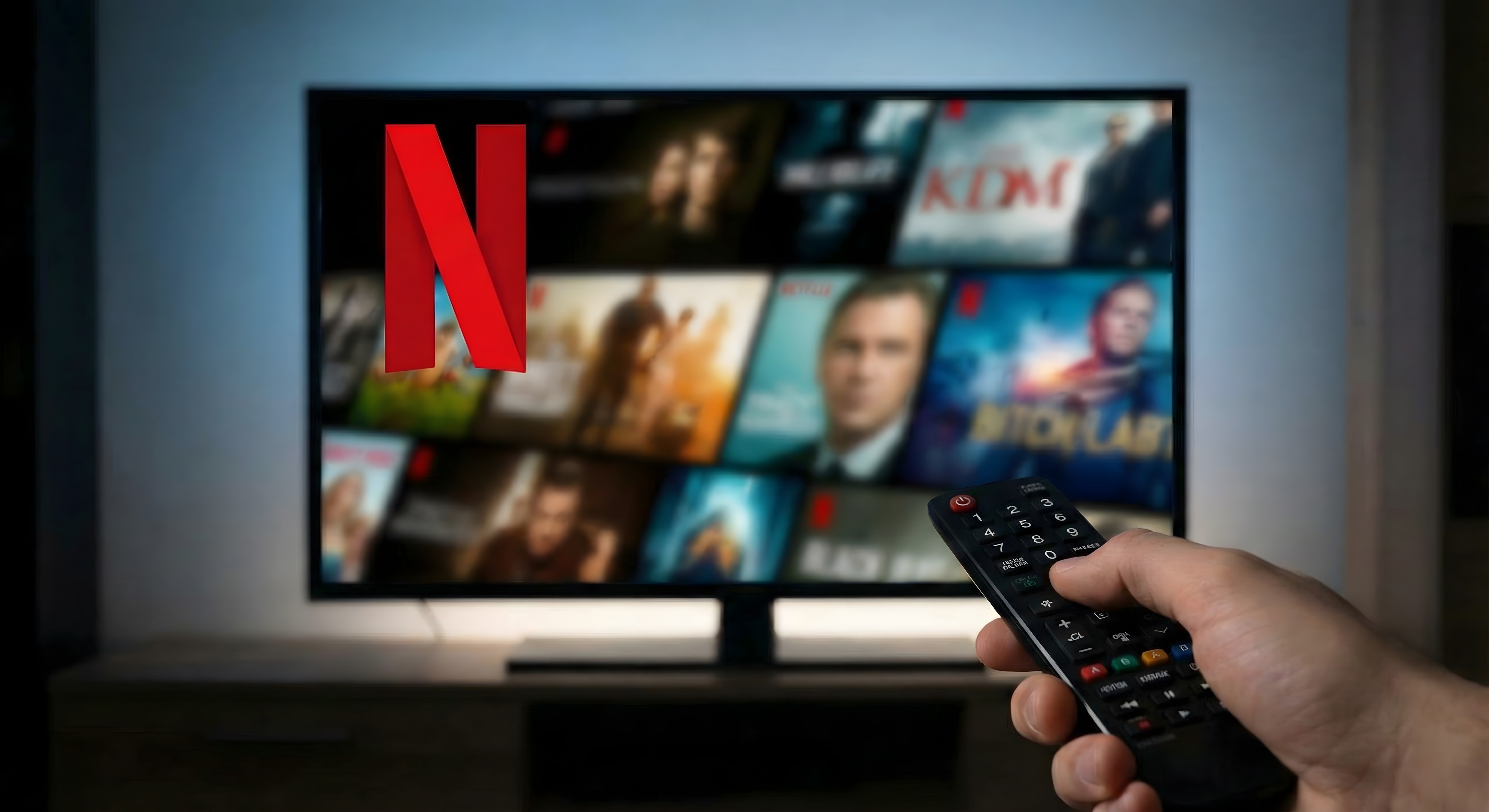 Das Bild zeigt einen Fernseher mit dem Netflix-Logo auf dem Bildschirm, der von einer Hand mit einer Fernbedienung bedient wird. Im Hintergrund ist eine Collage von verschiedenen Netflix-Inhalten zu sehen. Das Bild vermittelt den modernen Lifestyle des Streamings von Filmen und Serien im Wohnzimmer. Es eignet sich hervorragend als kostenloses Stockfoto für Beiträge rund um Streaming-Dienste, Unterhaltungselektronik und Medienkonsum in hochauflösender Qualität unter einer Creative-Commons-Lizenz.