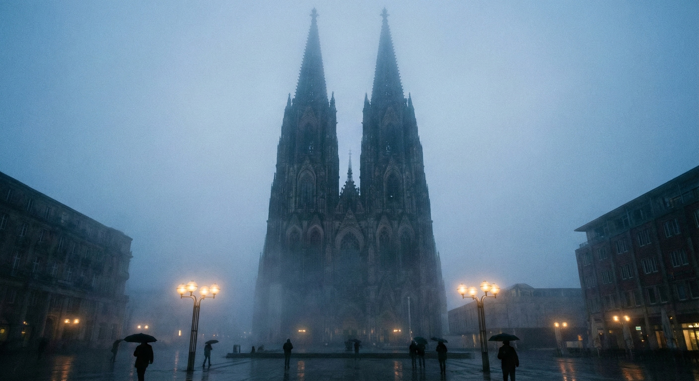 Dieses stimmungsvolle Foto zeigt den Kölner Dom, eine der bekanntesten gotischen Kathedralen Europas, in einer Nebellandschaft bei Dämmerung. Die beiden hohen Türme ragen majestätisch in den grauen Himmel, während Passanten mit Regenschirmen an der beleuchteten Fassade vorübereilen. Die düstere, romantische Atmosphäre verleiht dem Bild eine mystische Anmutung und macht es zu einem faszinierenden Motiv für die Verwendung in Blogs, Newslettern, sozialen Medien oder Werbematerialien. Dieses kostenloses Stockfoto in hoher Auflösung ist unter Creative Commons-Lizenz frei nutzbar.