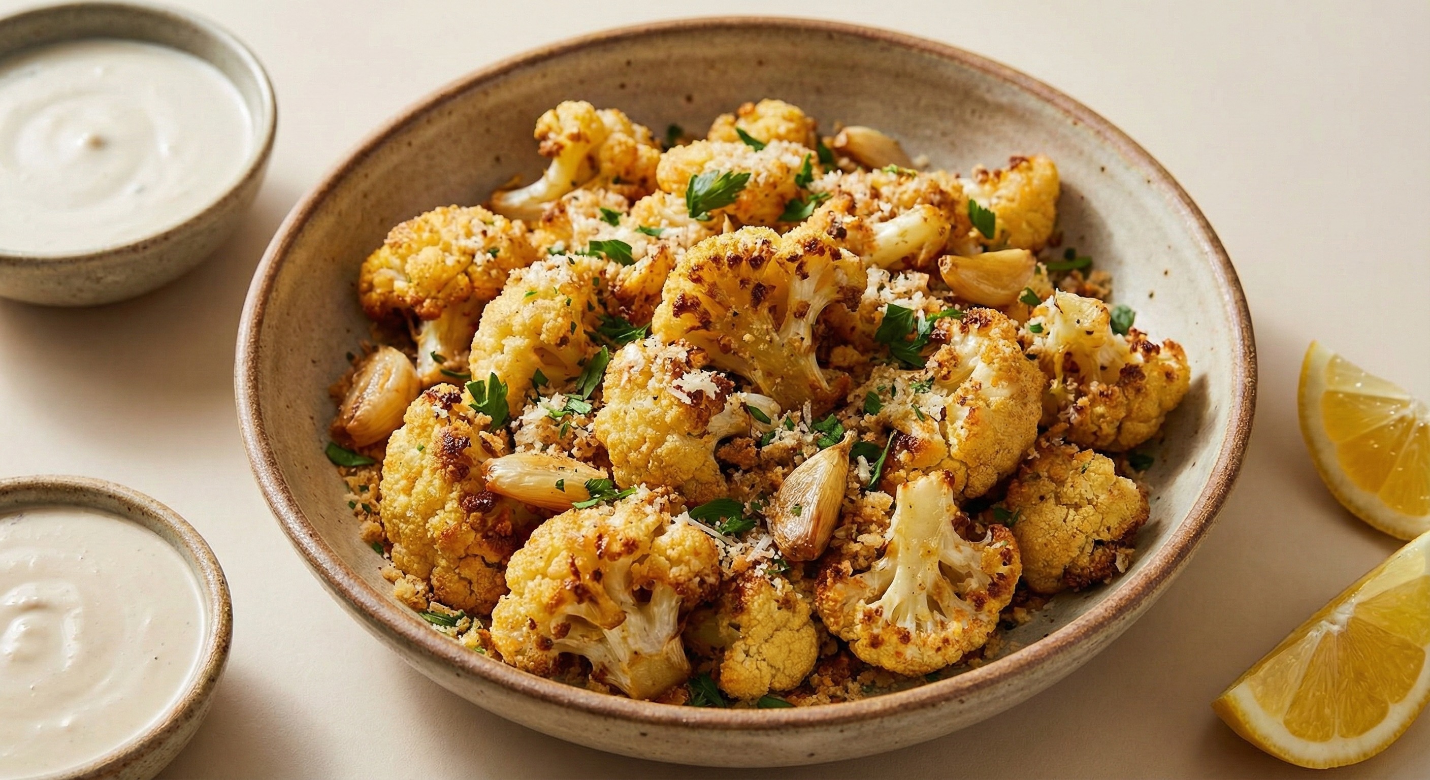 Dieses Foto zeigt einen knusprigen, gewürzten Blumenkohlsalat in einer braunen, rustikalen Schüssel. Der Blumenkohl ist goldbraun angebraten und mit Gewürzen wie Knoblauch und Petersilie verfeinert. Der Salat wirkt appetitlich und gesund, perfekt als Beilage oder leichtes Mittagessen. Dieses hochauflösende Stockfoto in Creative-Commons-Lizenz kann kostenfrei für Blogs, Social Media, Werbung und andere digitale Projekte verwendet werden.