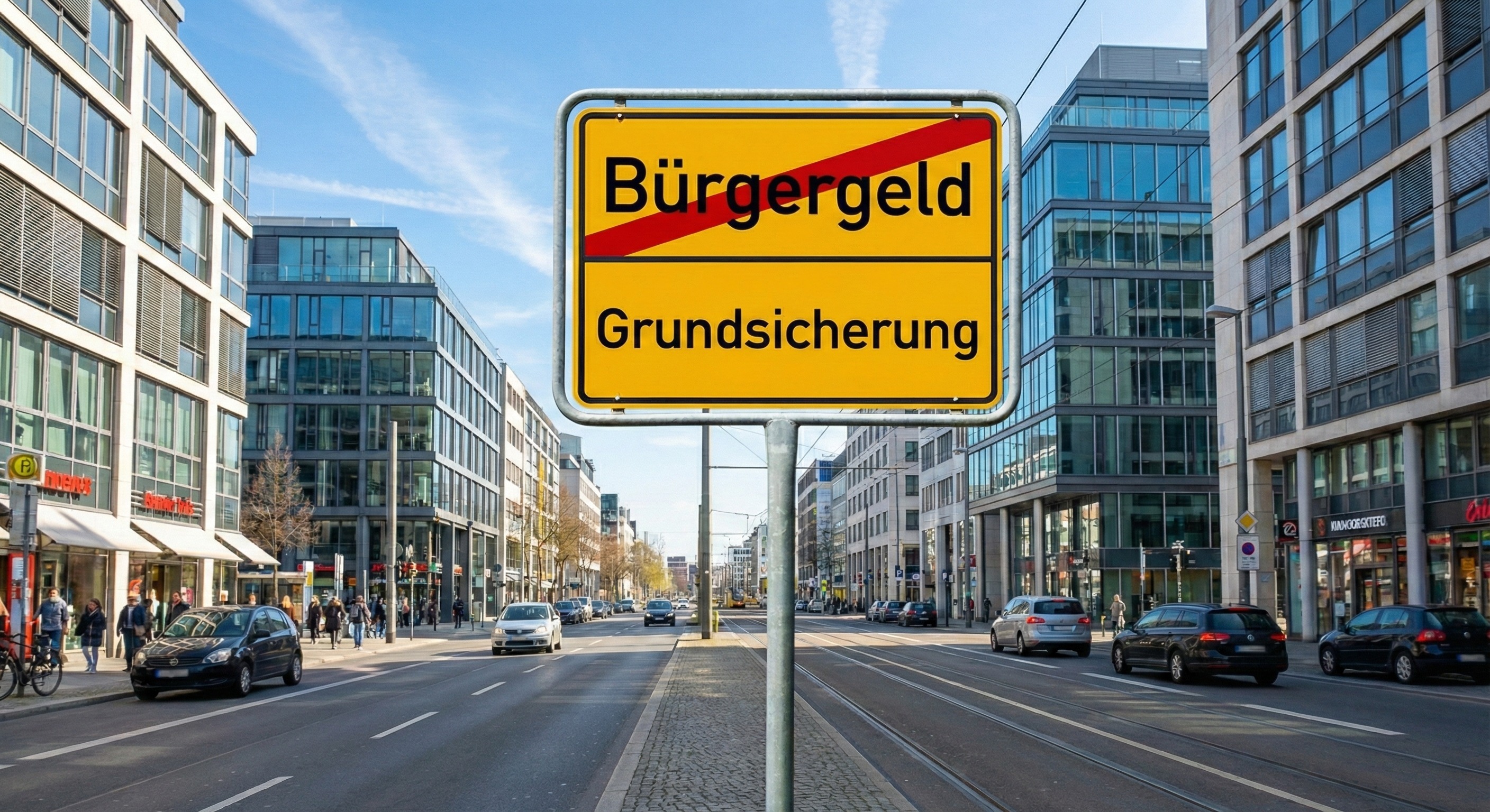 Dieses Foto zeigt ein Verkehrsschild an einer belebten Stadtstraße. Darauf sind die Begriffe 'Bürgergeld' und 'Grundsicherung' zu lesen. Im Hintergrund sind moderne Hochhäuser und Bürogebäude zu sehen, die die urbane Umgebung wiedergeben. Das Bild vermittelt einen Eindruck vom Stadtleben in Deutschland und kann für verschiedene Zwecke wie Blogbeiträge, Werbematerial oder Illustrationen in sozialen Medien genutzt werden. Das hochwertige Stockfoto ist in hoher Auflösung und unter der Creative-Commons-Lizenz verfügbar.