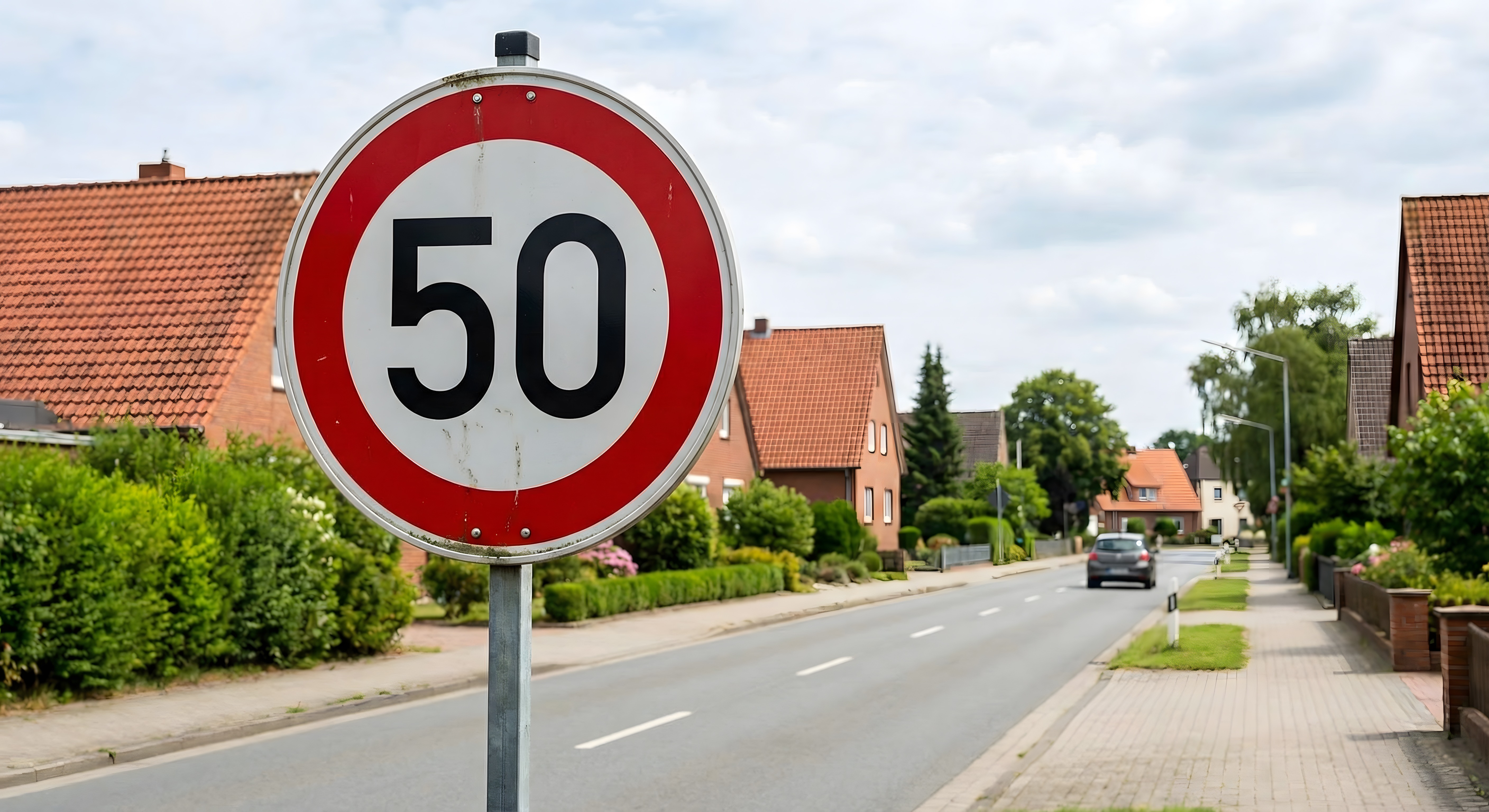 Das Foto zeigt ein Verkehrsschild, das eine Geschwindigkeitsbegrenzung von 50 km/h in einer ruhigen Wohngegend anzeigt. Das Schild ist rot umrandet und hat den Hauptfokus auf der gut lesbaren Ziffer '50'. Im Hintergrund sind Häuser und Bäume zu sehen, was die friedliche, wohnliche Umgebung widerspiegelt. Dieses Stockfoto eignet sich hervorragend für die Verwendung in Artikeln, Blogbeiträgen oder Social-Media-Postings, die sich mit Verkehrsmanagement, Sicherheit im Straßenverkehr, Umweltschutz oder Stadtplanung befassen. Es ist in hoher Auflösung und unter einer Creative-Commons-Lizenz frei verwendbar.