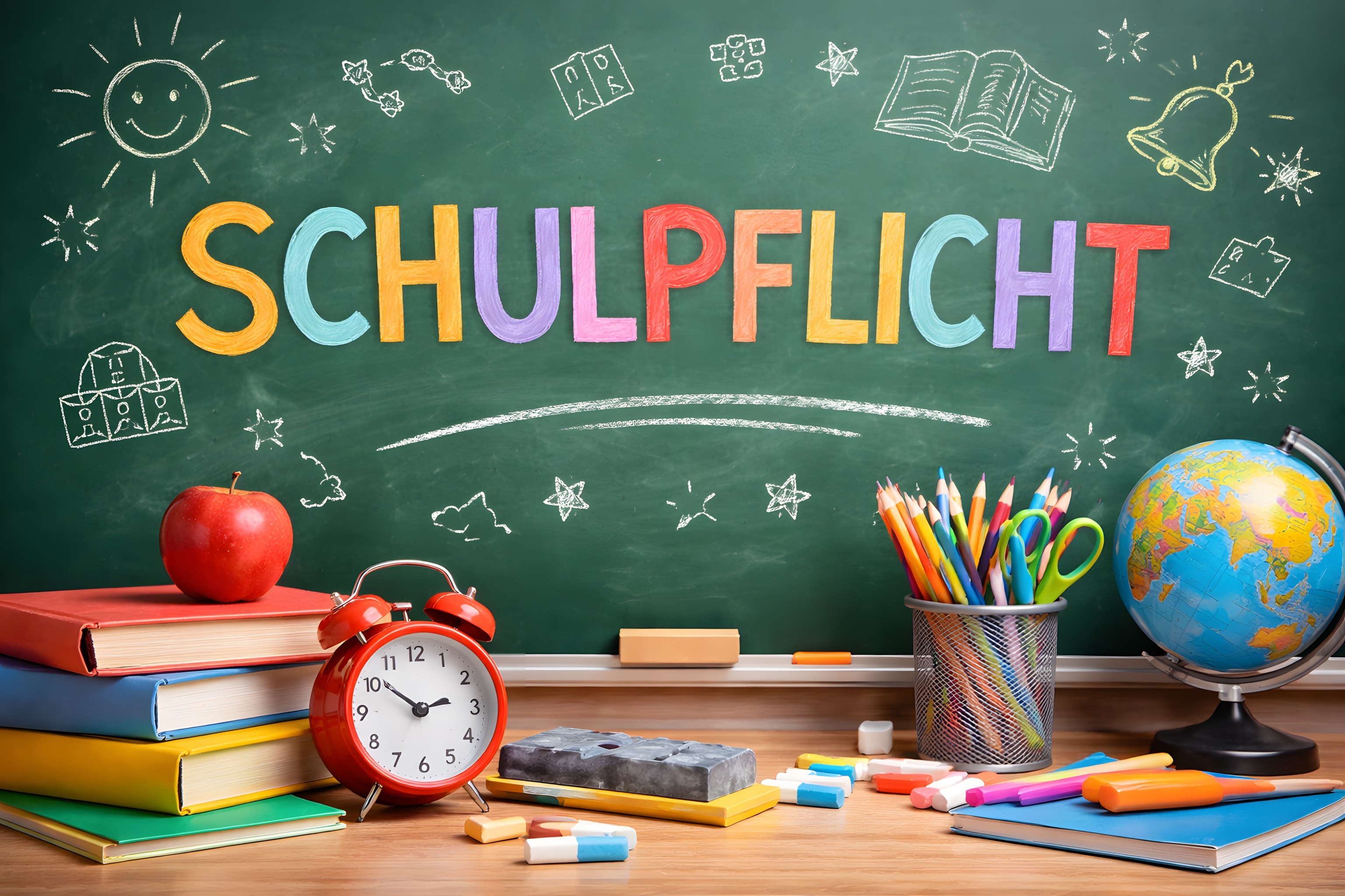 Dieses Foto zeigt eine typische Lernumgebung in einem Klassenzimmer. Im Vordergrund sehen wir einen Haufen an Lehr- und Lernmaterialien wie Bücher, Stifte, einen Globus und einen Wecker. Im Hintergrund ist eine grüne Tafel zu sehen, auf der in bunter Kreide-Schrift das Wort 'Schulpflicht' geschrieben steht. Umgeben ist die Tafel von farbenfrohen Symbolen und Zeichnungen wie der Sonne, Sternen und einem Schul-Rucksack, die eine kreative und lernfreudige Atmosphäre schaffen.