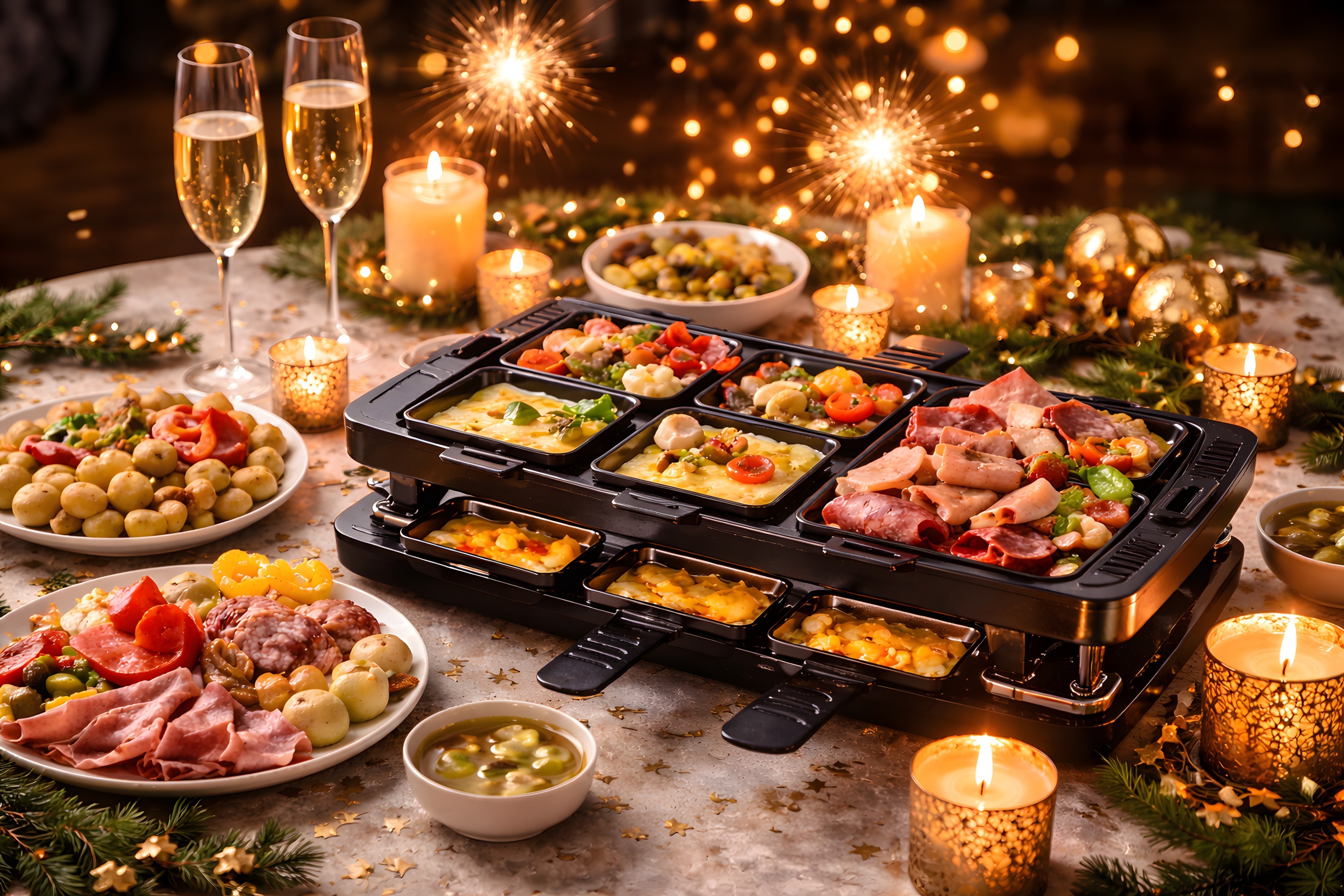 Dieses stimmungsvolle Foto zeigt einen festlich gedeckten Tisch für ein Raclette-Essen. Auf der Tischplatte finden sich verschiedene Leckereien wie Käse, Fleisch, Gemüse und Früchte, die in kleinen, geordneten Schälchen serviert werden. Dazu gibt es Gläser mit Sekt und Kerzen, die eine gemütliche Atmosphäre verbreiten. Im Hintergrund sind Wunderkerzen und Feuerwerk zu sehen, die die Feierlaune unterstreichen. Dieses hochwertige Stockfoto in hoher Auflösung eignet sich perfekt für die Verwendung in Blogs, Newslettern, Social-Media-Beiträgen oder Werbekampagnen rund um das Thema Feiern, Kochen und Genießen. Es steht unter einer Creative-Commons-Lizenz zur kostenlosen Nutzung zur Verfügung.