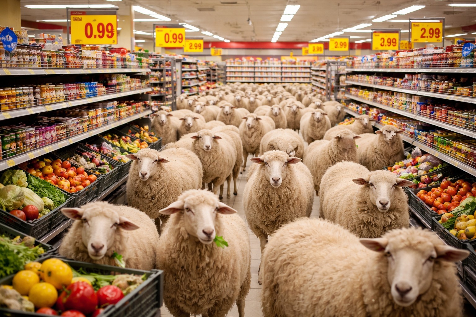 Das Bild zeigt eine ungewöhnliche Szene in einem Supermarkt - eine Herde Schafe, die sich zwischen den Regalen mit Obst und Gemüse bewegt. Die Tiere wirken friedlich und gelassen, als wären sie selbstverständlicher Teil des Ladenbetriebs. Das Bild hat einen surrealen, humorvollen Charakter und regt zum Nachdenken über unser Verhältnis zu Tieren und Lebensmitteln an. Es könnte als kostenloses Stockfoto in hoher Auflösung für Blog-Beiträge, Newsletter oder Social-Media-Werbung rund um Themen wie Nachhaltigkeit, Tierfreundlichkeit oder Konsumkritik verwendet werden. Die Lizenz unter Creative Commons erlaubt die uneingeschränkte Nutzung des Fotos.