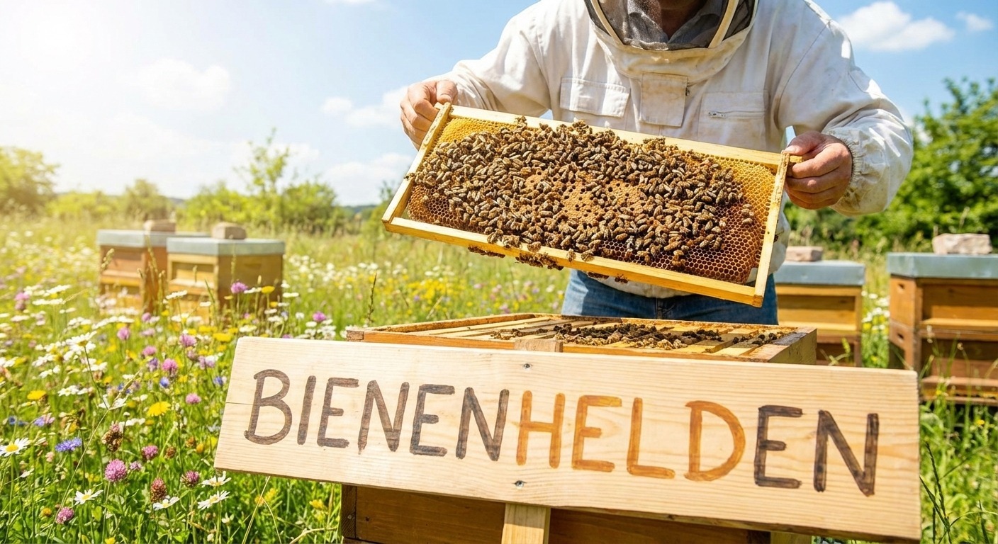 Das Foto zeigt einen Imker, der stolz eine Bienenwabe präsentiert, umgeben von einer blühenden Sommerwiese. Der Arbeitsplatz des Imkers ist inmitten der Natur, umgeben von bunten Blumen und grünen Bäumen. Dies unterstreicht die Bedeutung der Bienenhaltung für ein intaktes Ökosystem. Das Bild vermittelt eine Botschaft von Nachhaltigkeit, Ökologie und dem wertvollen Beitrag der Bienen für unsere Umwelt. Als hochwertiges Stockfoto eignet es sich hervorragend für Verwendungen in Blogs, Newslettern, Social-Media-Kanälen oder Werbematerialien rund um Themen wie Landwirtschaft, Bio-Produkte, Umweltschutz oder Bildungsarbeit. Die kostenlose, hochauflösende Verwendung unter Creative-Commons-Lizenz ist möglich.