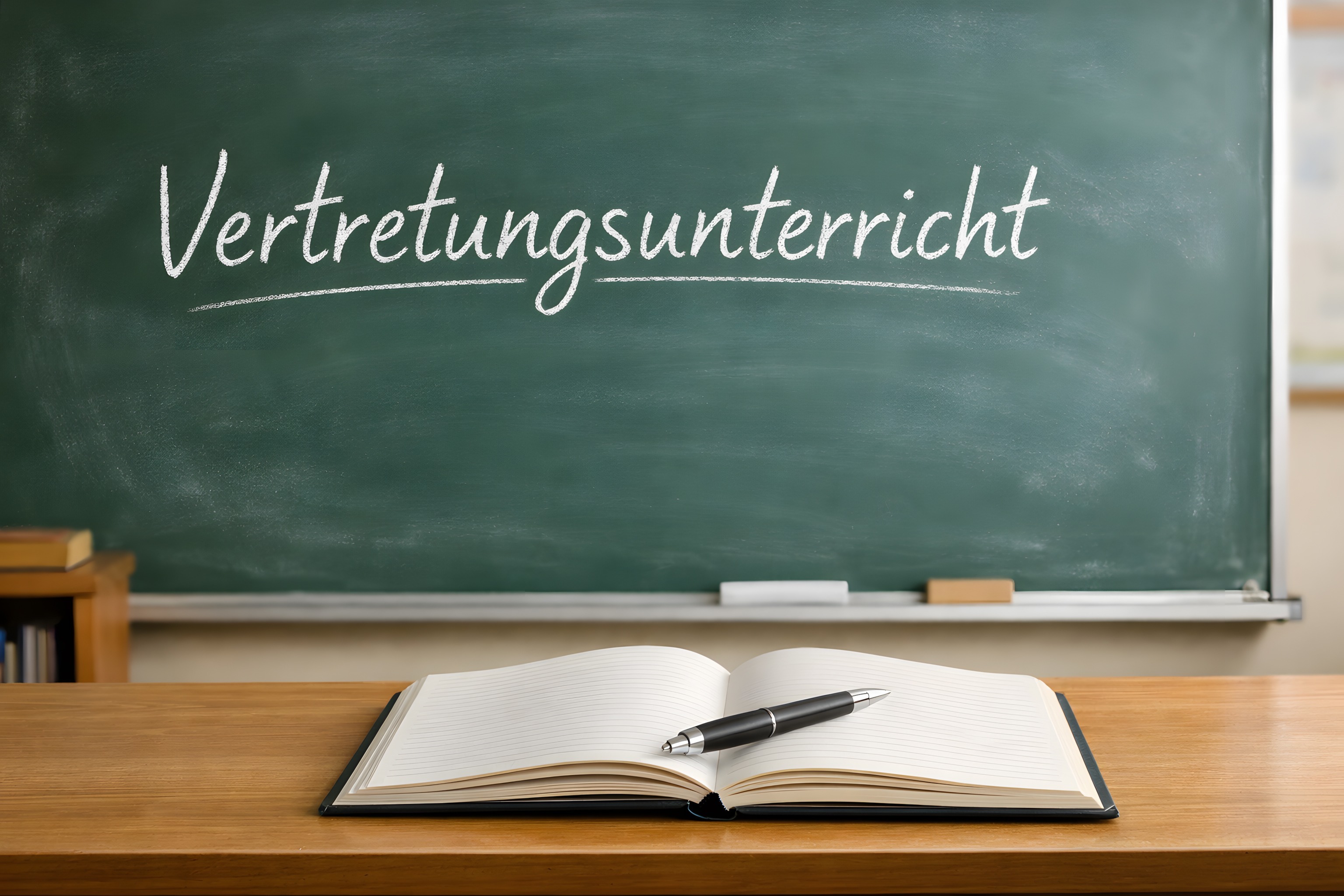Das Bild zeigt einen Klassenraum mit einer grünen Kreidetafel, auf der 'Vertretungsunterricht' geschrieben steht. Auf einem Holztisch vor der Tafel liegt ein aufgeschlagenes Buch mit einem Stift darauf, was auf eine Unterrichtssituation hindeutet. Der Raum wirkt aufgeräumt und lädt zum Lernen ein. Dieses Stockfoto in hoher Auflösung kann für Blogbeiträge, Newsletter oder Social-Media-Posts zum Thema Bildung, Lehre und Unterricht verwendet werden. Es steht unter einer Creative-Commons-Lizenz und kann kostenfrei genutzt werden.