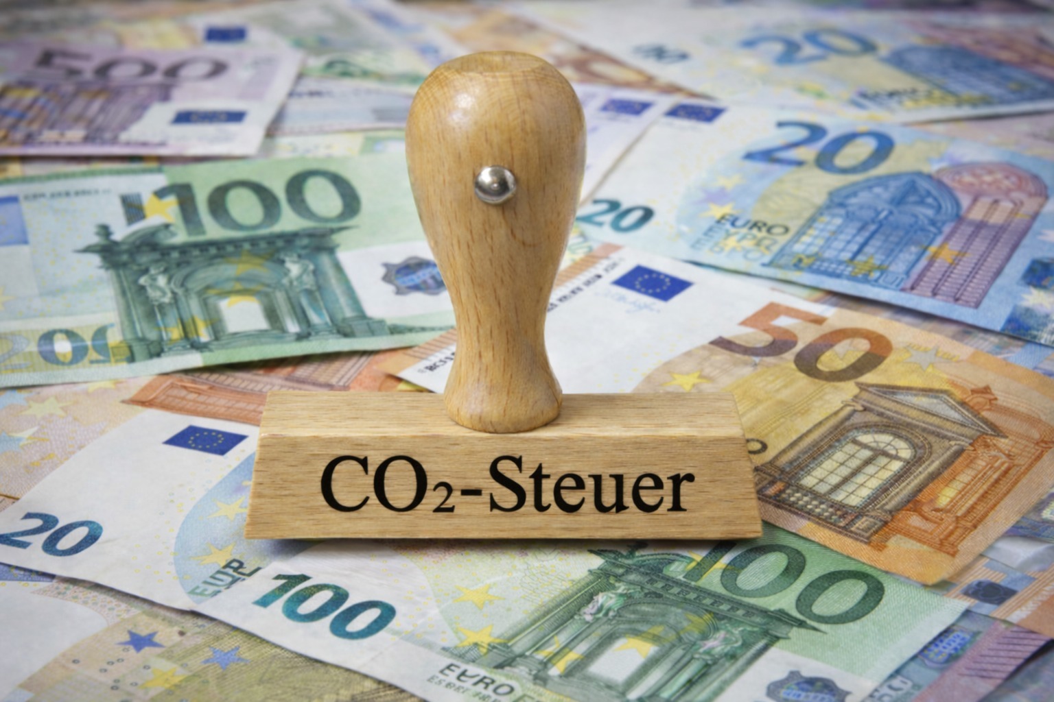 Das Foto zeigt einen Holzstempel mit der Aufschrift 'CO2-Steuer' auf einem Hintergrund aus verschiedenen Euro-Banknoten. Es symbolisiert die aktuellen Diskussionen und Bestrebungen zur Einführung einer CO2-Steuer als Teil der Klimapolitik in Europa. Die Banknoten im Hintergrund repräsentieren die wirtschaftlichen Auswirkungen und Zusammenhänge einer solchen Steuer.