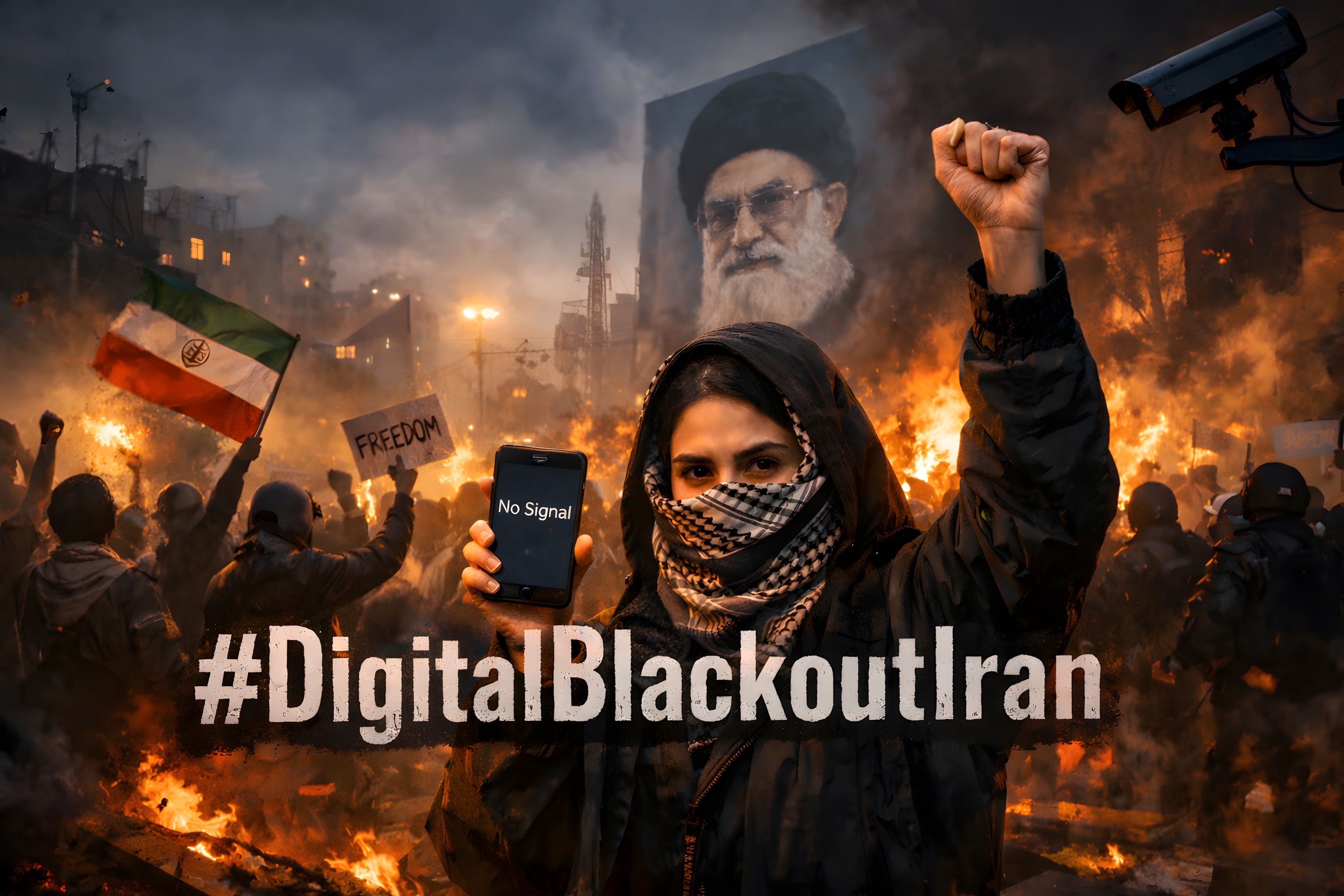 Das Bild zeigt eine chaotische Kundgebung in Iranische Metropole. Im Vordergrund steht eine vermummte Person, die ein Smartphone mit der Aufschrift 'No Signal' hält. Im Hintergrund ist ein Porträt des Revolutionsführers Khomeini zu sehen, umgeben von Flammen und Rauchschwaden. Die Demonstranten schwenken Fahnen und Transparente mit Slogans wie '#DigitalBlackoutIran'. Es handelt sich um ein kraftvolles Foto, das die Spannungen und Unruhen im Iran widerspiegelt.