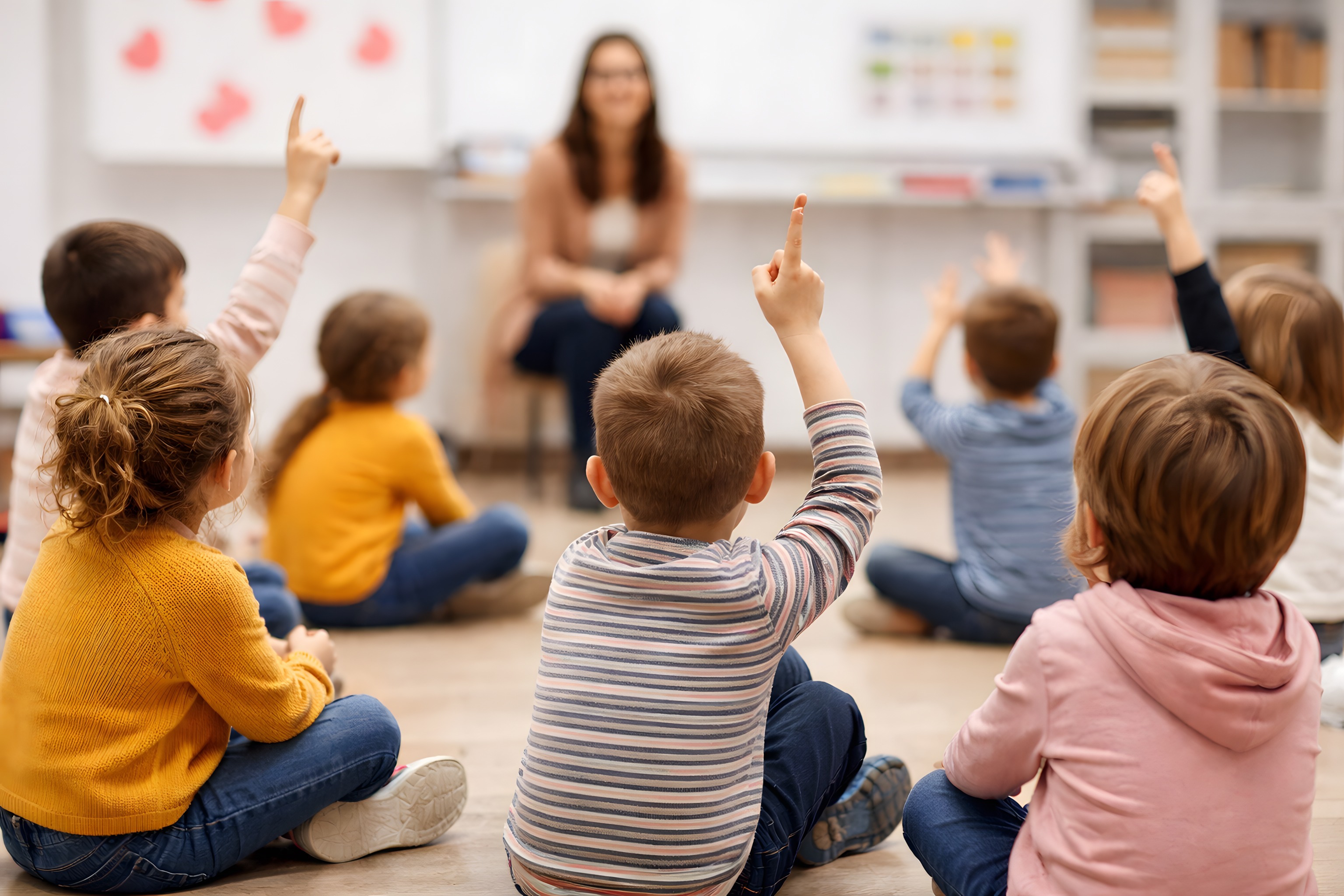 Das Bild zeigt eine fröhliche Lernatmosphäre in einem Klassenzimmer. Eine Lehrerin sitzt mit einer Gruppe von Kindern im Kreis und scheint sie bei einer interaktiven Aktivität zu unterstützen. Die Kinder sitzen auf dem Boden, heben ihre Hände und strahlen Neugier und Engagement aus. Der Raum ist hell und freundlich eingerichtet, mit bunten Dekorationen an den Wänden, die auf eine kreative Lernumgebung hinweisen.