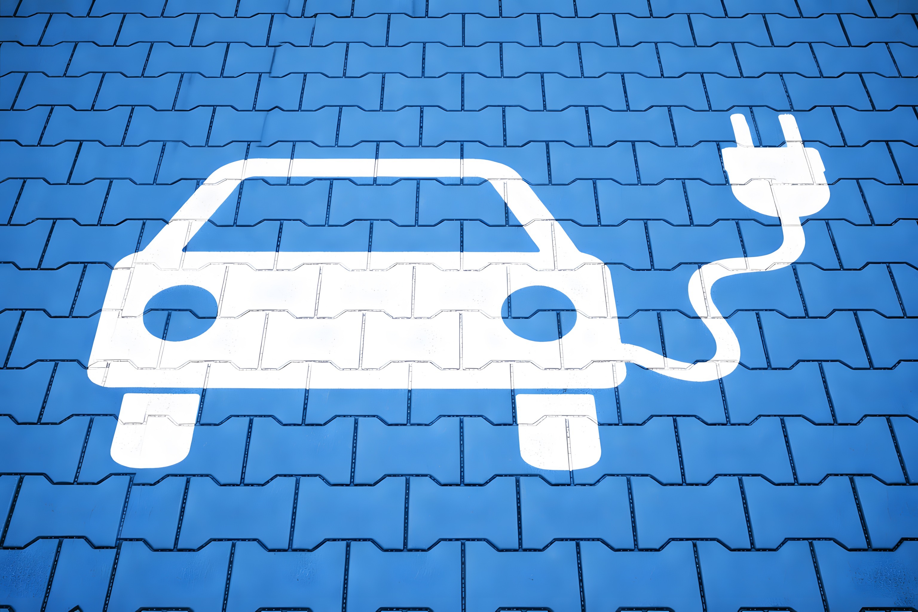 Dieses Bild zeigt ein Piktogramm, das ein Elektroauto und einen elektrischen Stecker darstellt. Das weiße Symbol befindet sich auf einem blauen Hintergrund, der aus geometrischen Pflastersteinen besteht. Das Bild hat einen minimalistischen und modernen Stil und könnte für Themen rund um Elektromobilität, Nachhaltigkeit oder öffentliche Infrastruktur eingesetzt werden. Als kostenloses Stockfoto in hoher Auflösung unter Creative-Commons-Lizenz eignet es sich ideal für Blogs, Social-Media-Posts, Werbematerialien und andere visuelle Anwendungen.
