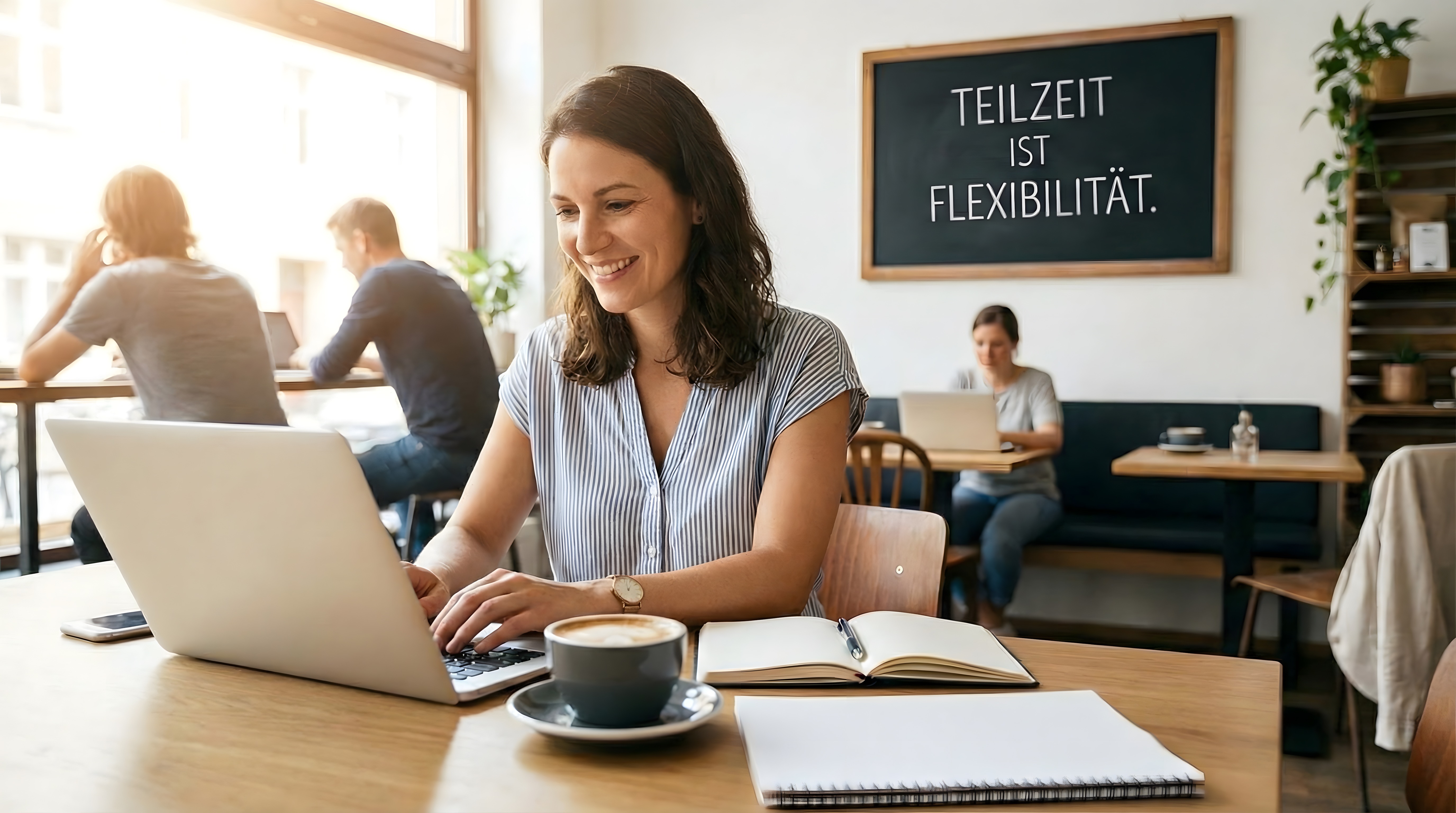 Dieses Foto zeigt eine moderne, flexible Arbeitsumgebung in einem gemütlichen Café-Setting. Eine lächelnde Frau arbeitet konzentriert an ihrem Laptop, umgeben von Holzmöbeln, einer Tafel und anderen Mitarbeitern. Die Atmosphäre ist einladend und inspirierend, mit Andeutungen von Kreativität und Teamwork. Dieses kostenloses Stockfoto in hoher Auflösung unter Creative-Commons-Lizenz ist ideal für Blogbeiträge, Social-Media-Posts oder Werbekampagnen zum Thema moderne, flexible Arbeitswelt, Teilzeit und Work-Life-Balance.