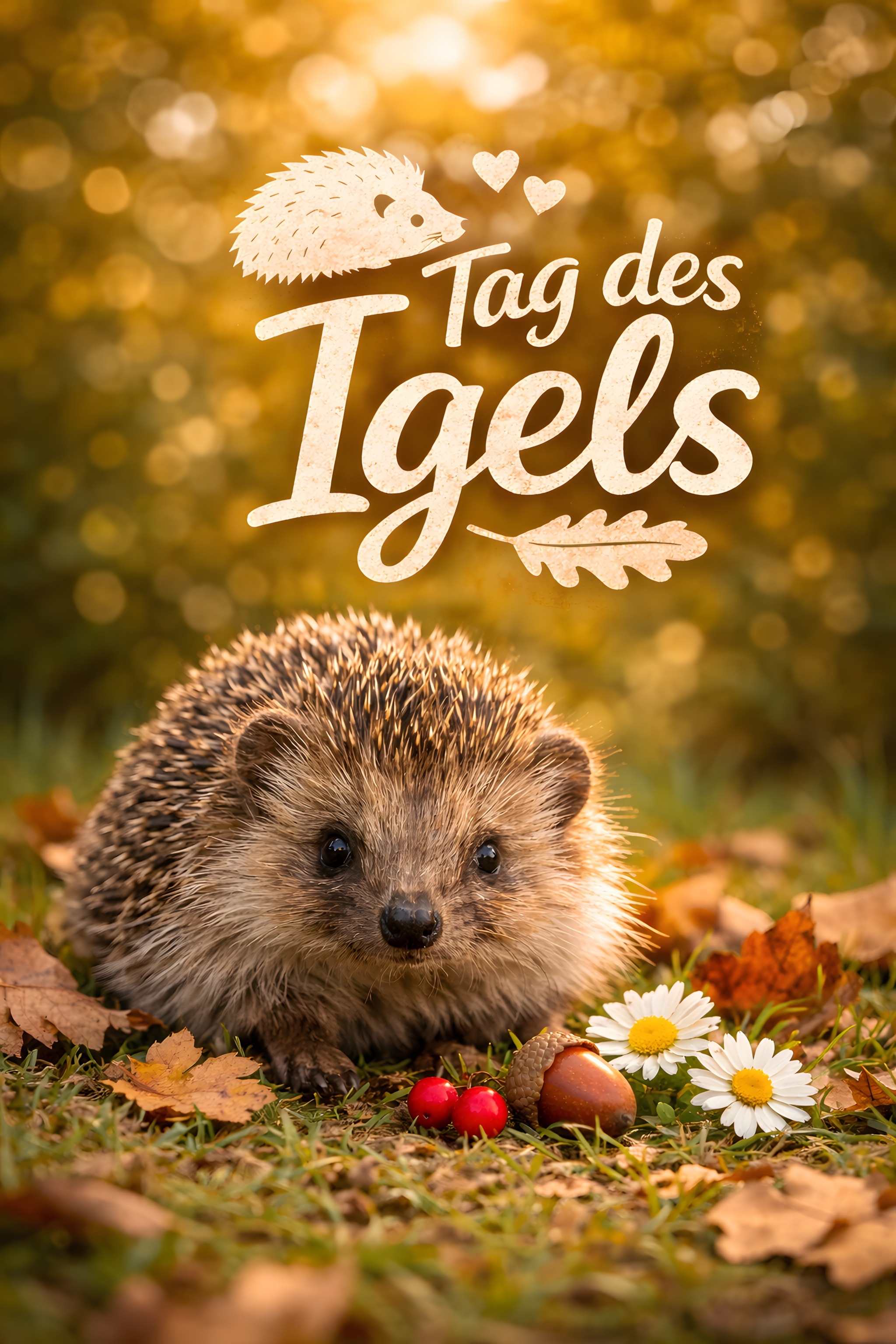 Das bezaubernde Bild zeigt einen entzückenden Igel, der umgeben von herbstlichen Blättern, Blumen und Früchten in einer idyllischen Naturlandschaft ruht. Der Igel ist in scharfer Fokussierung dargestellt, während der Hintergrund in einem warmen, golden-orangenen Bokeh-Effekt verschwimmt. Die Komposition ist ausgewogen und einladend, mit den Herzen, die sich über dem Igel zu schweben scheinen. Dieses Stockfoto eignet sich hervorragend für Werbe- und Marketingmaterialien, Blog-Beiträge, Newsletter-Designs und andere Anwendungen, in denen ein liebevoller, naturnaher Akzent gesetzt werden soll. Es ist in hoher Auflösung und unter einer Creative-Commons-Lizenz kostenfrei verfügbar.
