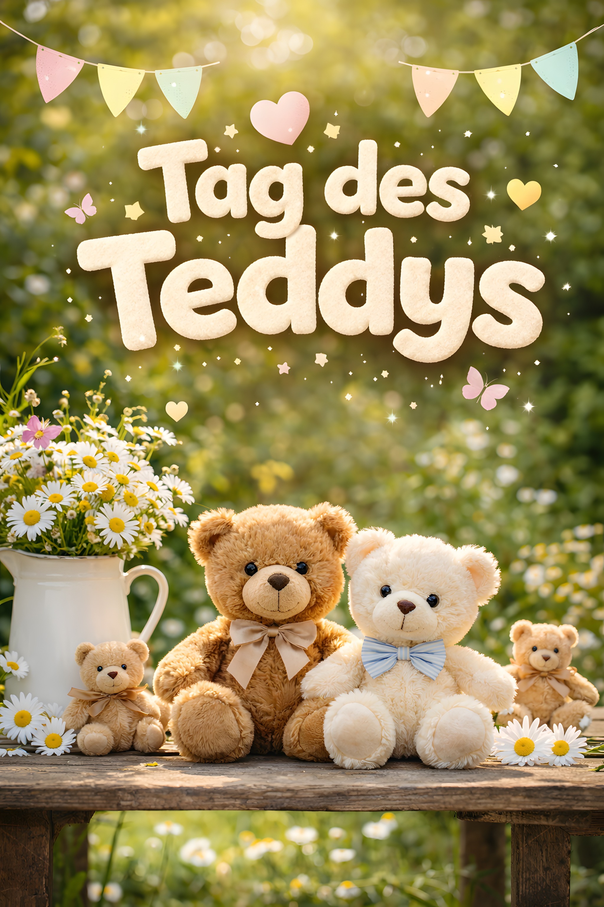 Dieses bezaubernde Foto zeigt eine fröhliche Szene zum Teddytag. Drei niedliche Teddybären in verschiedenen Farben sitzen auf einem hölzernen Tisch, umgeben von einer malerischen Blumenwiese. Im Hintergrund sind bunte Wimpelgirlanden und funkelnde Sterne zu sehen, die eine feierliche Atmosphäre schaffen. Das Bild strahlt Gemütlichkeit, Nostalgie und Kinderfreude aus und eignet sich hervorragend für Grußkarten, Geschenkartikel oder Werbung rund um den Teddytag. Als hochwertiges Stockfoto in hoher Auflösung ist es unter einer Creative-Commons-Lizenz frei nutzbar.