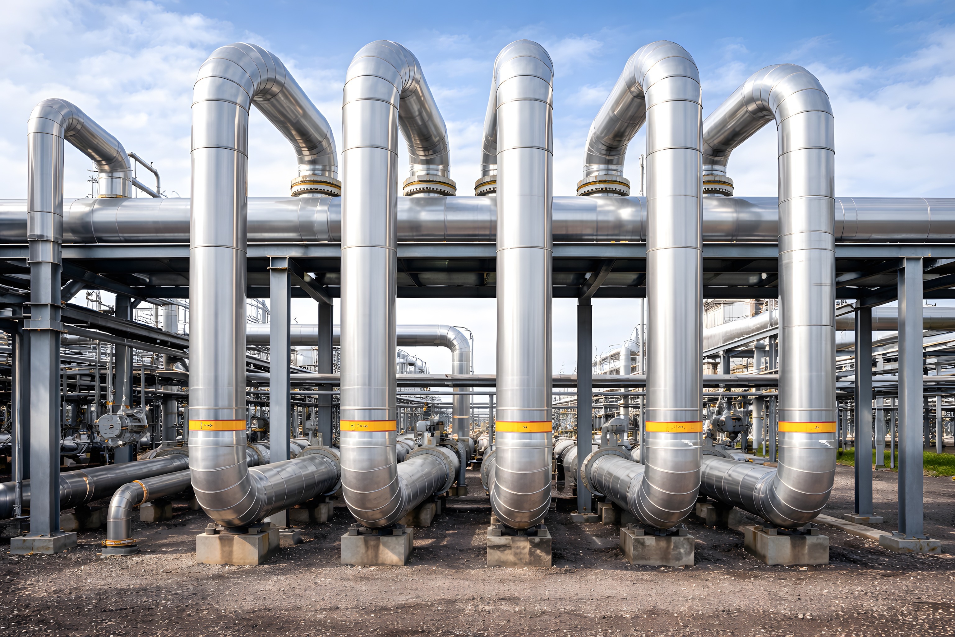 Dieses Foto zeigt eine industrielle Rohrleitungsanlage für die Gasförderung. Die Anlage besteht aus mehreren, parallel verlaufenden Metallrohren, die von einer Stahlkonstruktion getragen werden. Die Rohre sind glänzend silberfarben und werden von gelben Ventilen und Verteilern unterbrochen. Die Szene vermittelt einen Eindruck von der komplexen Infrastruktur und Technologie, die für die Energiegewinnung und -verteilung erforderlich sind. Dieses Stockfoto eignet sich hervorragend für Illustrationen in Berichten, Artikeln oder Werbematerialien zur Energiewirtschaft, Industrieproduktion oder Konstruktion. Es ist in hoher Auflösung verfügbar und unter einer Creative-Commons-Lizenz nutzbar.