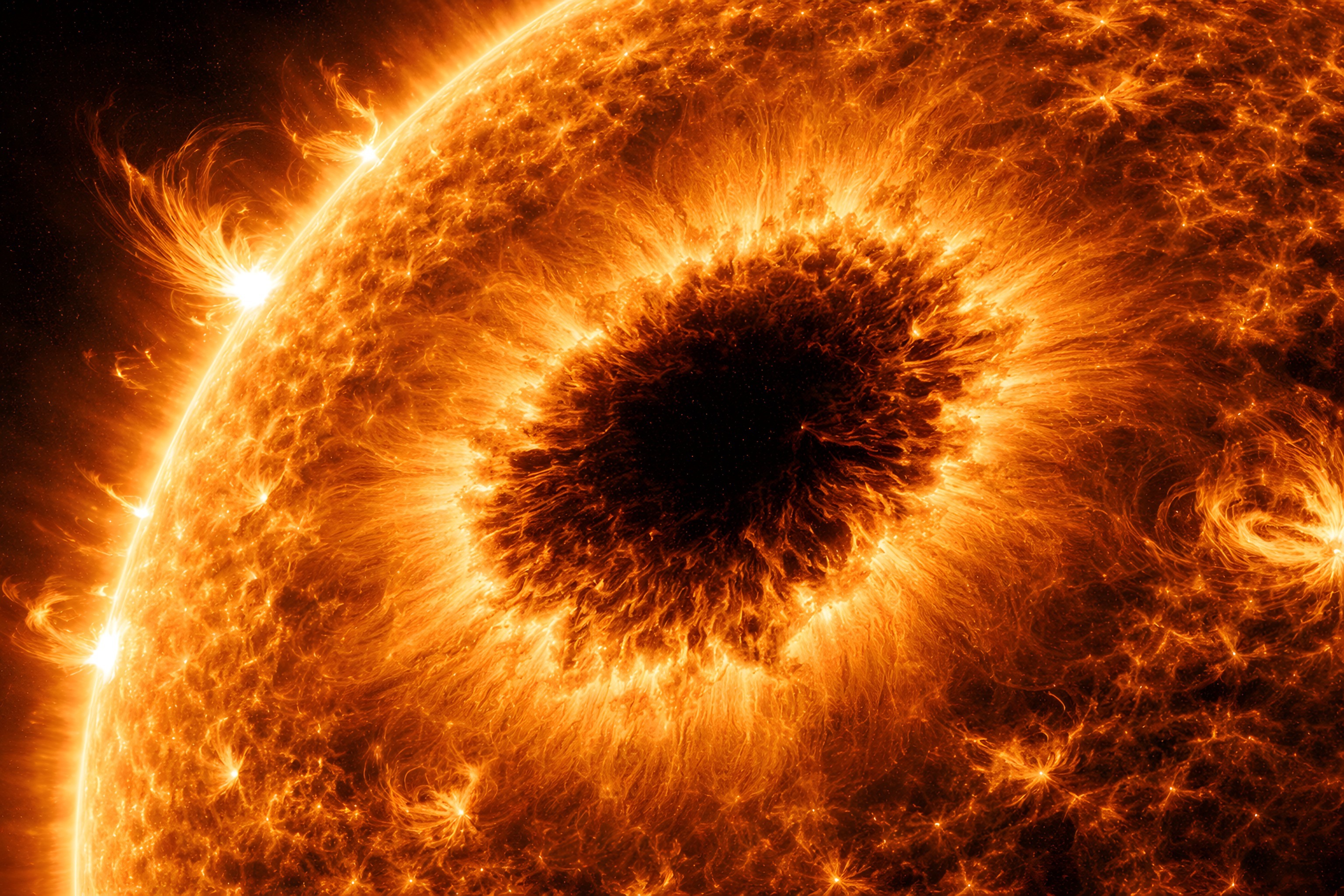 Dieses faszinierende Bild zeigt einen Ausschnitt der aktiven Sonnenoberfläche in intensiven Rottönen. Der zentrale, dunkle Bereich ist ein sogenannter Sonnenfleck, eine Stelle mit erhöhter magnetischer Aktivität und verminderter Temperatur auf der Sonne. Umgeben ist der Sonnenfleck von einem Meer lodernder, gelb-orangener Flammen, die die enorme Energie und Hitze der Sonne widerspiegeln. Dieses kraftvolle, kosmische Motiv eignet sich hervorragend als Hintergrundbild oder Eyecatcher für Blogs, Newsletter und soziale Medien rund um Themen wie Astronomie, Physik oder alternative Energien. Als kostenloses Stockfoto in hoher Auflösung und unter einer Creative-Commons-Lizenz nutzbar.
