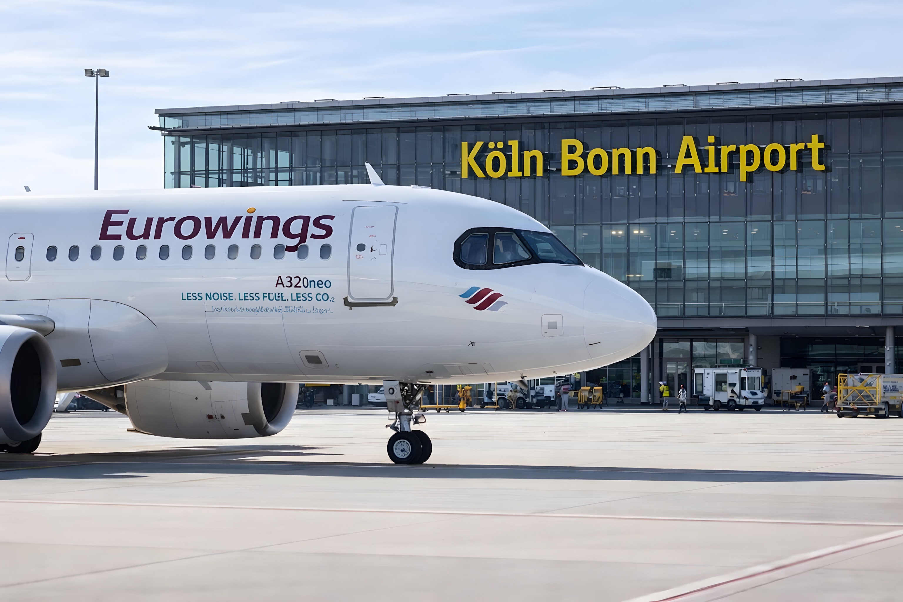 Das Foto zeigt einen Airbus A320neo-Passagierjet der Fluggesellschaft Eurowings am Köln-Bonn Airport, einem der größten Flughäfen Deutschlands. Das moderne, gläserne Flughafengebäude im Neoklassizismus-Stil ist im Hintergrund zu sehen. Das Bild vermittelt den Eindruck von Mobilität, Reisen und moderner Luftfahrttechnologie. Dieses hochwertige, kostenlose Stockfoto ist in hoher Auflösung unter einer Creative-Commons-Lizenz verfügbar und eignet sich hervorragend für Beiträge zum Thema Reisen, Tourismus oder Luftverkehr in Blogs, Newslettern oder Social-Media-Kanälen.