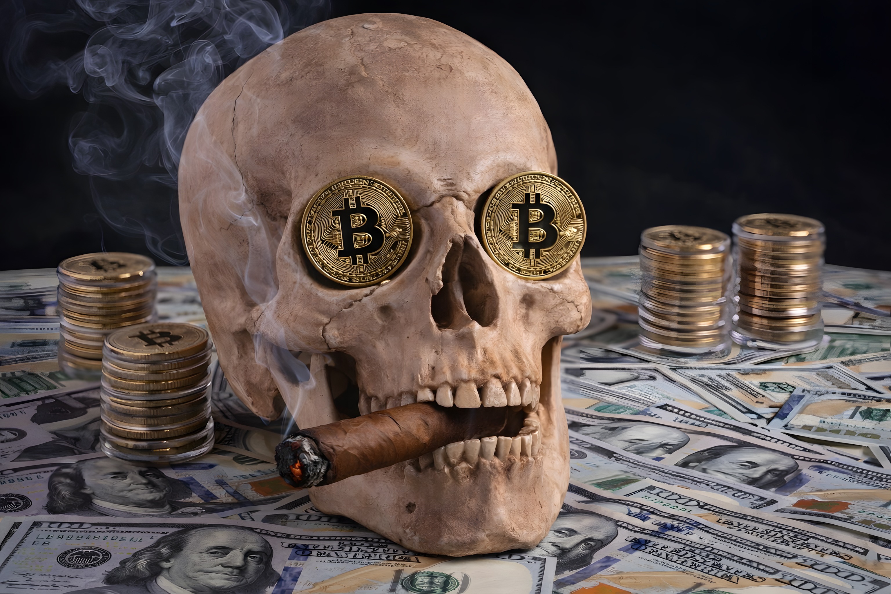 Dieses Stockfoto zeigt einen Totenkopf, der durch Bitcoin-Münzen anstelle der Augen blickt, umgeben von Dollarnoten und Rauchschwaden. Die düstere Szene vermittelt das Konzept von Risiko, Verlust und Gefahr in der Welt der Kryptowährungen und Finanzen. Das Bild eignet sich hervorragend für Blogs, Newsletter oder Social-Media-Beiträge zum Thema Wirtschaftskrise, Investitionen und digitale Währungen. Dieses hochauflösende Foto steht unter einer Creative-Commons-Lizenz zur kostenlosen Verwendung zur Verfügung.