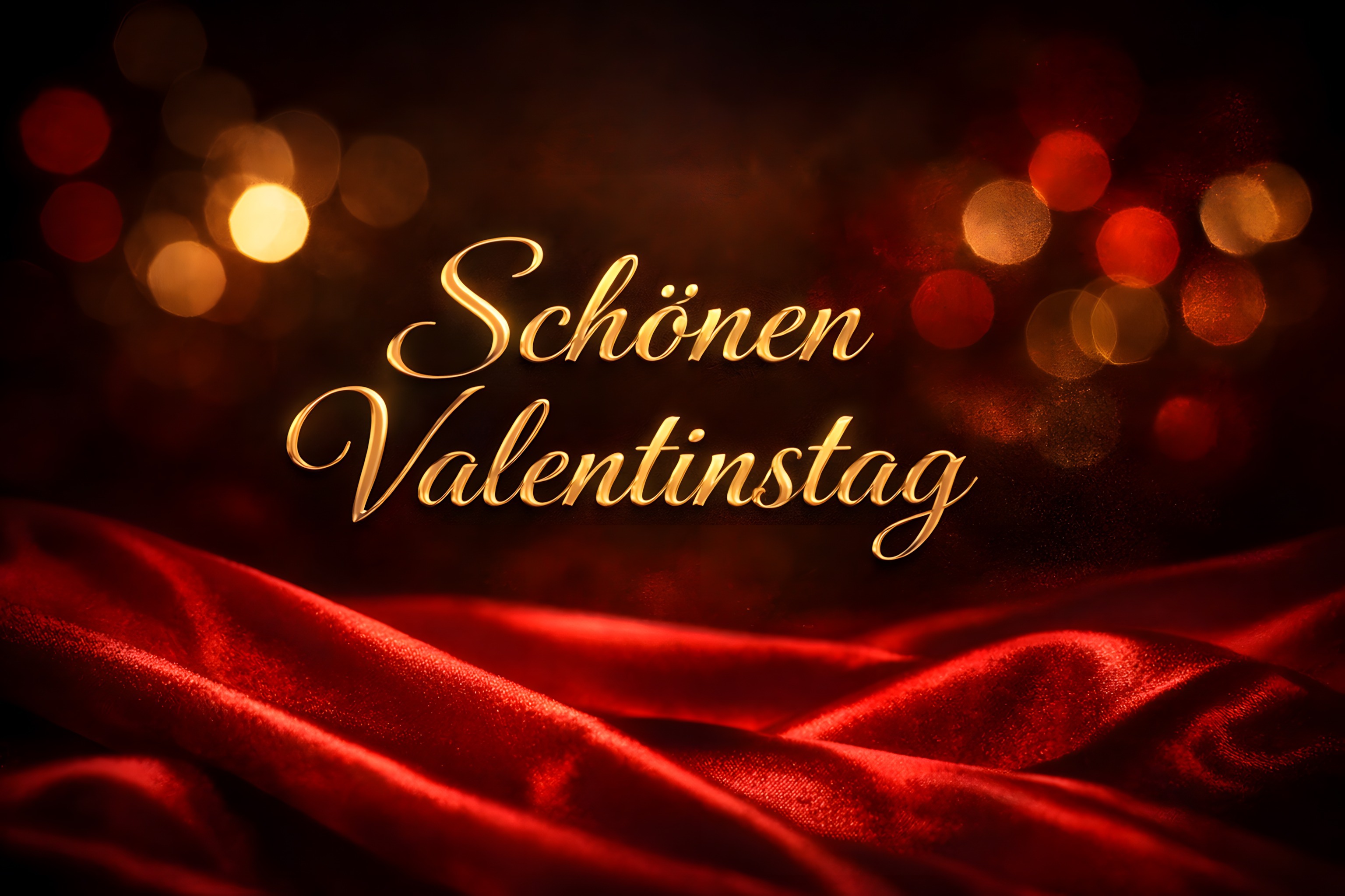 Das Bild zeigt eine stimmungsvolle Valentinstagsszenerie mit einer goldenen Schrift 'Schönen Valentinstag' auf einem Hintergrund aus weichem, rotem Samt. Der Fokus liegt auf der romantischen Botschaft, die durch die warme Beleuchtung mit unscharfen roten und goldenen Lichtpunkten zusätzlich an Atmosphäre gewinnt. Dieses Stockfoto eignet sich hervorragend für Valentinstagskarten, romantische Blog-Beiträge, Werbe-Posts in sozialen Medien oder Newsletter-Layouts. Es ist in hoher Auflösung verfügbar und steht unter einer Creative-Commons-Lizenz zur freien Nutzung bereit.