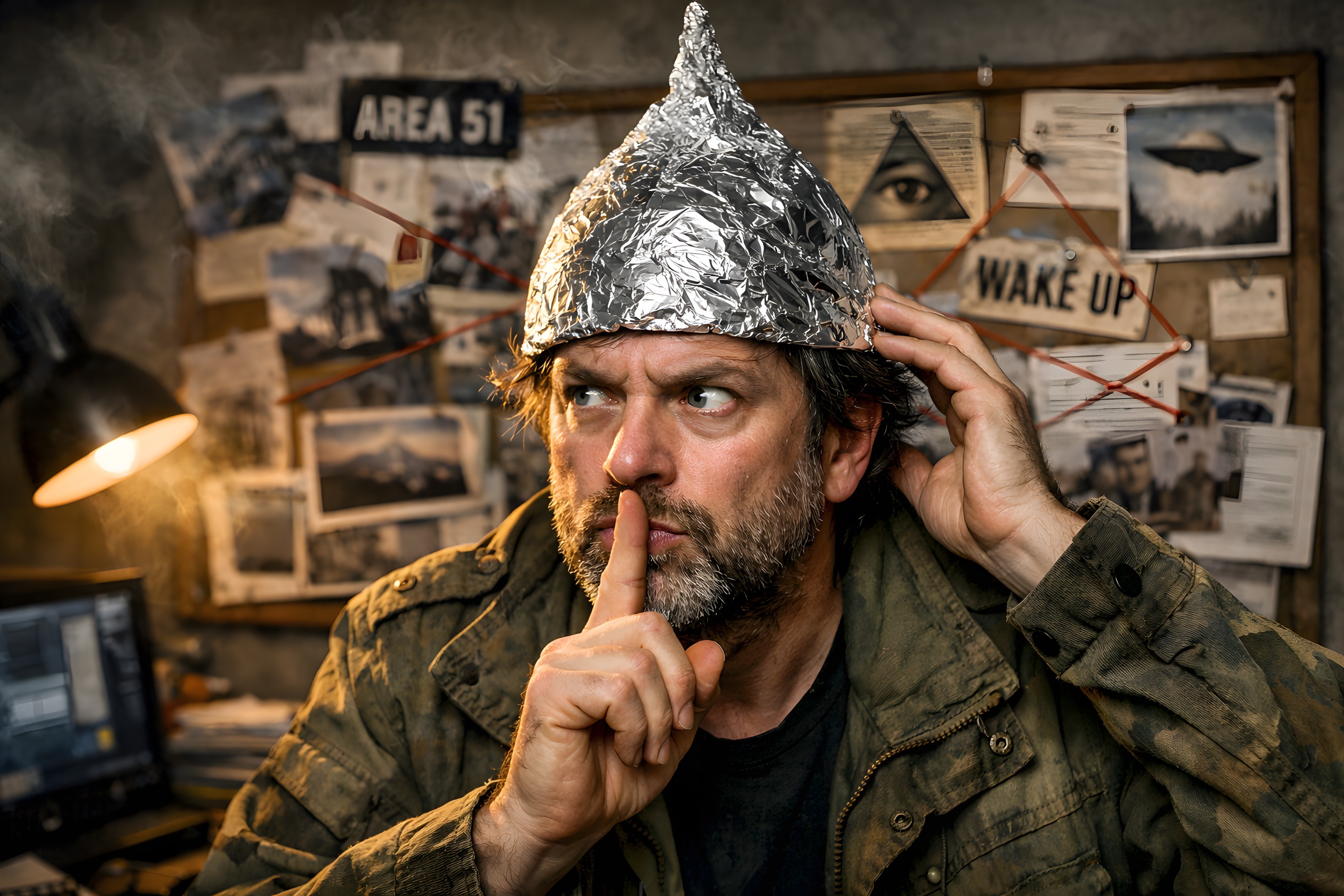 Das Foto zeigt einen Mann mit Alufolienhut, der nachdenklich mit einem Finger auf den Lippen vor einer Wand mit verschiedenen Symbolen und Warnungen wie 'WAKE UP' und 'AREA 51' steht. Die düstere Atmosphäre und die Requisiten deuten auf eine Verschwörungstheorie hin, die den Mann zu beschäftigen scheint. Dieses Stockfoto eignet sich gut für Beiträge zu Themen wie Paranoia, Skepsis gegenüber offiziellen Darstellungen oder auch humorvolle Darstellungen von Verschwörungstheoretikern. Es ist in hoher Auflösung und unter einer Creative-Commons-Lizenz verfügbar.