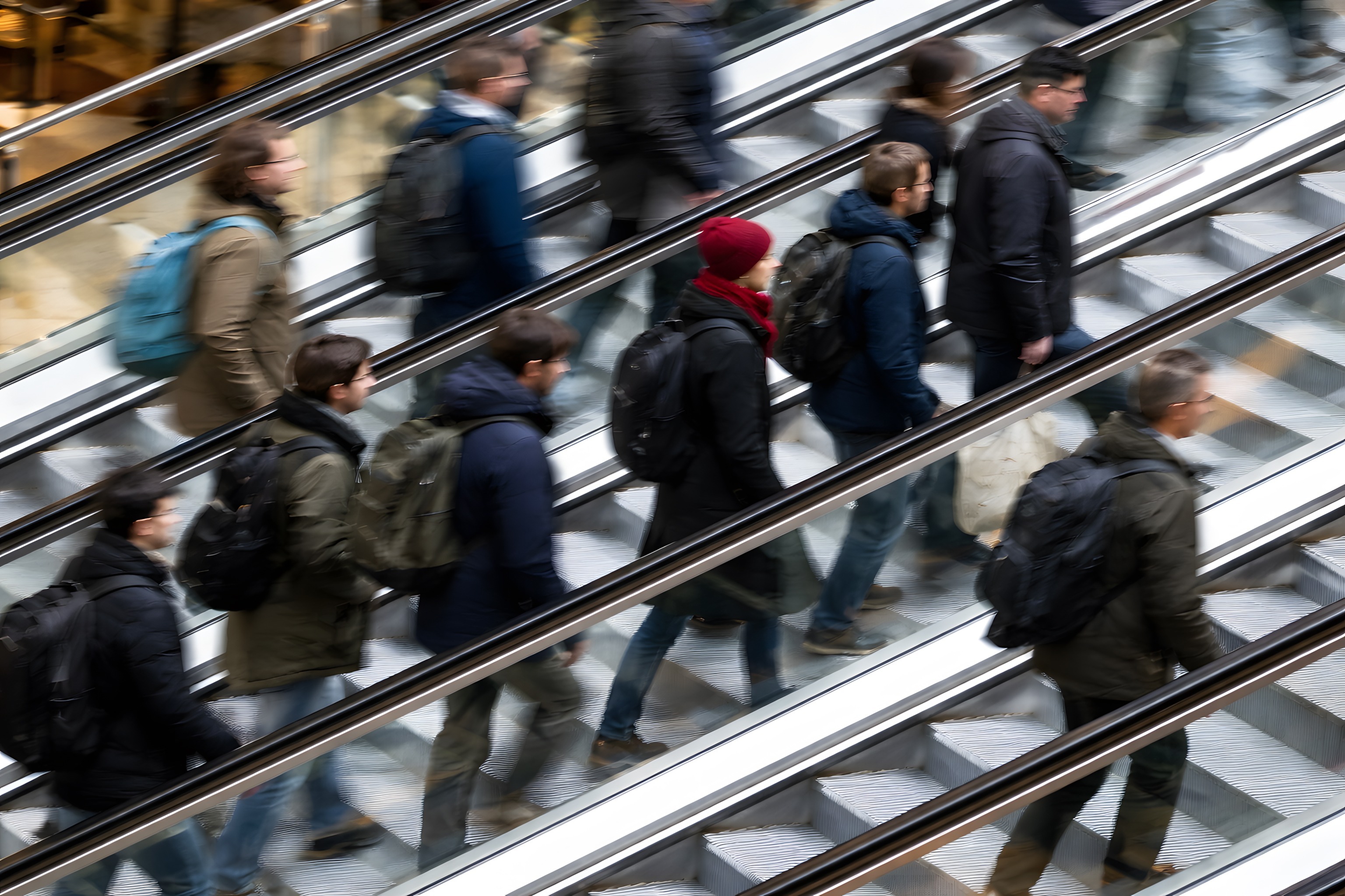 Das Foto zeigt eine belebte Szene in einer modernen Bahnhofshalle. Mehrere Reihen von Rolltreppen führen hinauf und hinunter, auf denen eine Menschenmenge in Bewegung ist. Die Perspektive lässt den Betrachter mitten in das Geschehen eintauchen. Durch die Unschärfe der Personen entsteht ein dynamischer Bewegungseffekt, der die Hektik und Eile des Bahnhofsverkehrs widerspiegelt. Die Farbgebung in dunklen Tönen verleiht der Szene eine professionelle, geschäftliche Atmosphäre.