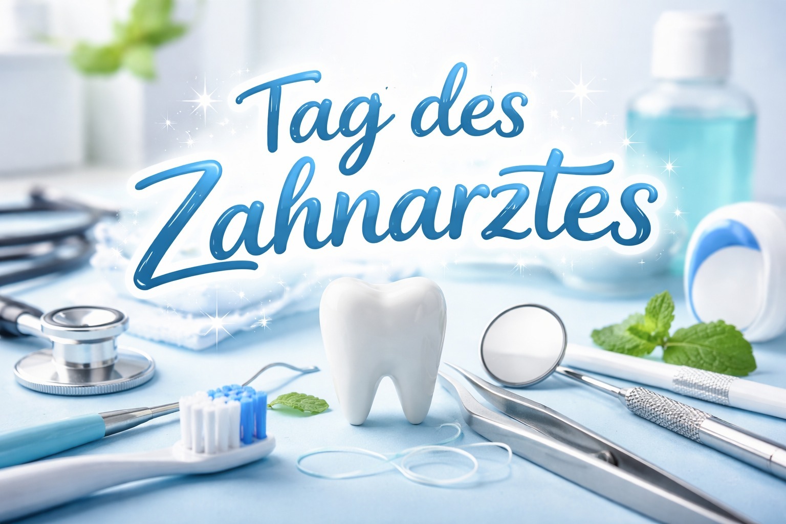 Das Bild zeigt eine Vielzahl von Utensilien und Instrumenten aus einer Zahnarztpraxis, die typisch für den Zahnarztberuf und die Zahnpflege sind. Im Vordergrund ist ein weißer Zahn zu sehen, umgeben von einem Zahnarztspiegel, einer Pinzette, einer Zahnbürste und Zahnpasta. Im Hintergrund sind weitere Werkzeuge wie ein Stethoskop, Mundwasser und frische Minzeblätter zu erkennen. Die Farbgebung in Blau und Weiß vermittelt einen sauberen, frischen und professionellen Eindruck. Dieses hochwertige Stockfoto eignet sich ideal für Blogbeiträge, Newsletter oder Social-Media-Posts rund um den Zahnarztberuf, Mundpflege und Gesundheitsvorsorge. Das Bild ist in hoher Auflösung verfügbar und kann unter einer Creative-Commons-Lizenz kostenfrei verwendet werden.