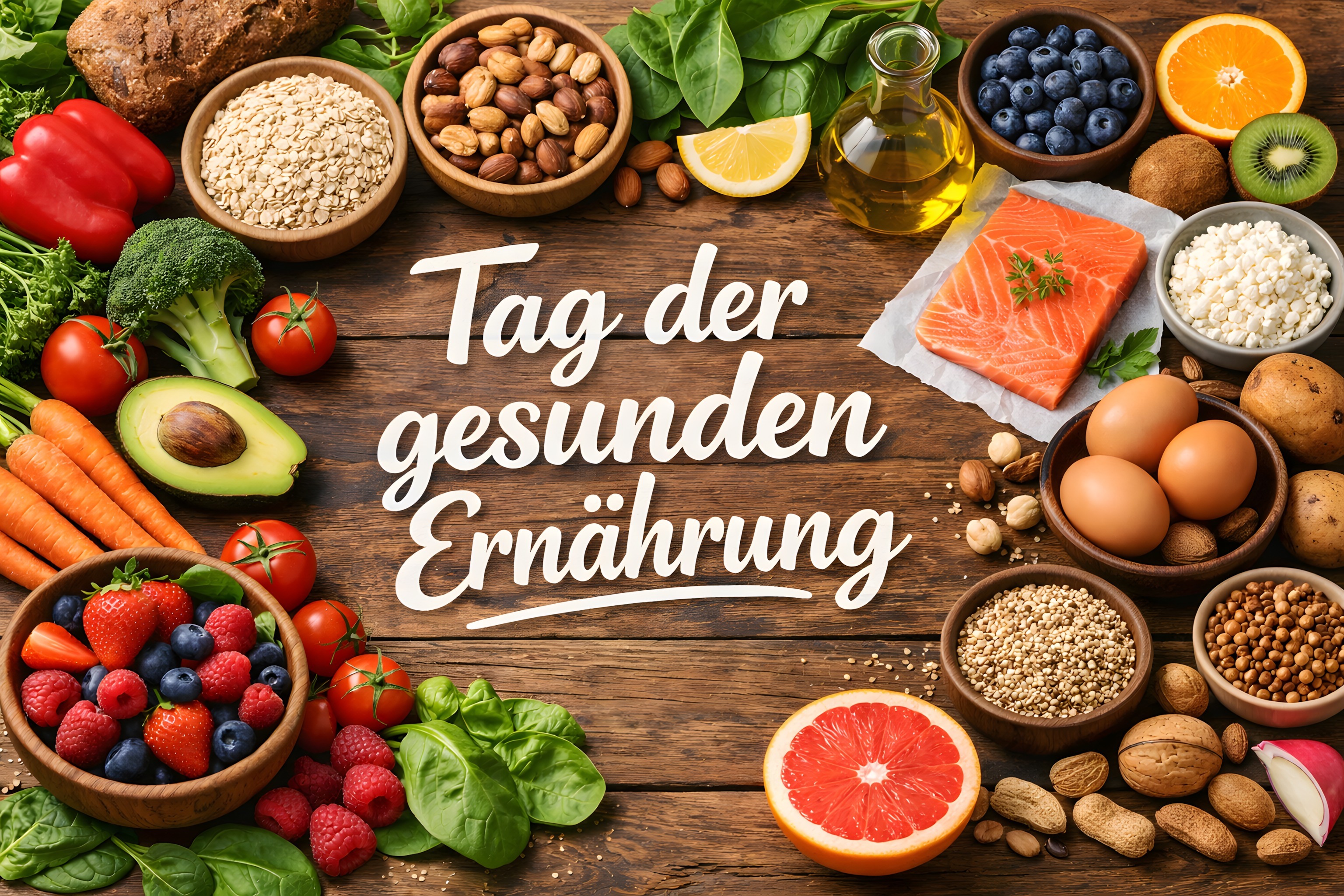 Dieses Bild zeigt eine Vielzahl gesunder Lebensmittel, die für eine ausgewogene und ausgewogene Ernährung stehen. Auf dem Holztisch sehen wir verschiedene Obst- und Gemüsesorten wie Tomaten, Avocados, Brokkoli, Möhren und Blaubeeren. Daneben finden sich Nüsse, Samen, Vollkornprodukte, Eier und Fisch. Die Anordnung der Zutaten lässt vermuten, dass das Bild für ein gesundes Rezept oder einen Ernährungstipp verwendet werden könnte. Insgesamt vermittelt das Foto einen Eindruck von Frische, Natürlichkeit und Gesundheit, was es zu einem idealen Stockfoto für Blogbeiträge, Social-Media-Posts oder Werbekampagnen rund um das Thema Ernährung macht. Dieses hochwertige, kostenlose Foto ist in hoher Auflösung und unter einer Creative-Commons-Lizenz verfügbar.