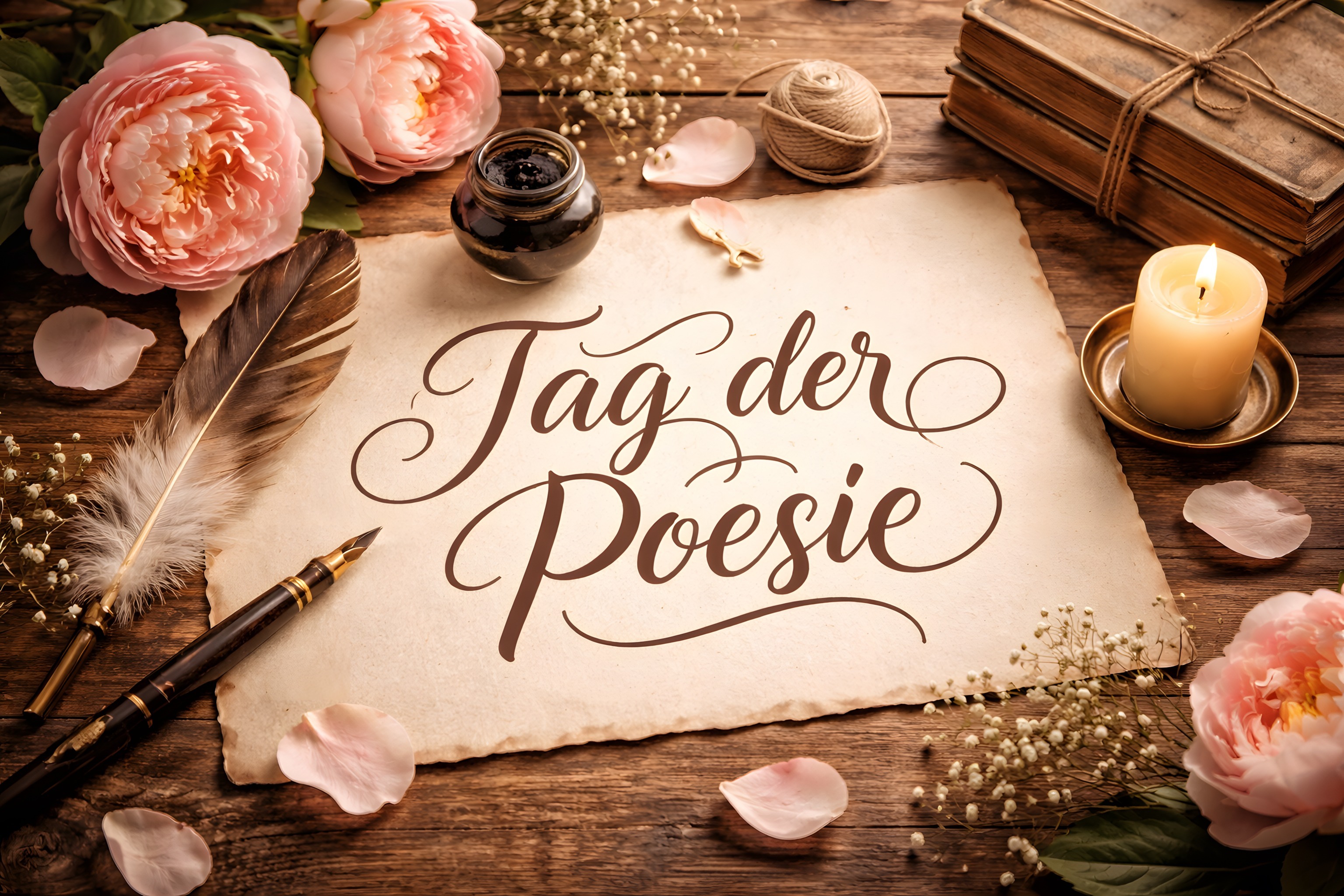 Dieses romantische Foto zeigt eine Szene, die perfekt zum Tag der Poesie passt. Im Vordergrund liegt eine Feder auf einem antiken Blatt Papier, auf dem in kunstvoll geschwungener Kalligrafie der Text 'Tag der Poesie' geschrieben steht. Umgeben ist das Arrangement von zarten Rosenblüten, einem Tintenglas, alten Büchern und einer brennenden Kerze. Insgesamt vermittelt das Bild eine nostalgische und kreative Atmosphäre, ideal für die Präsentation von Poesie, Literatur oder schreibbezogenen Inhalten in Blogs, Newslettern oder sozialen Medien. Dieses hochauflösende Stockfoto steht unter der Creative Commons-Lizenz zur kostenlosen Nutzung bereit.