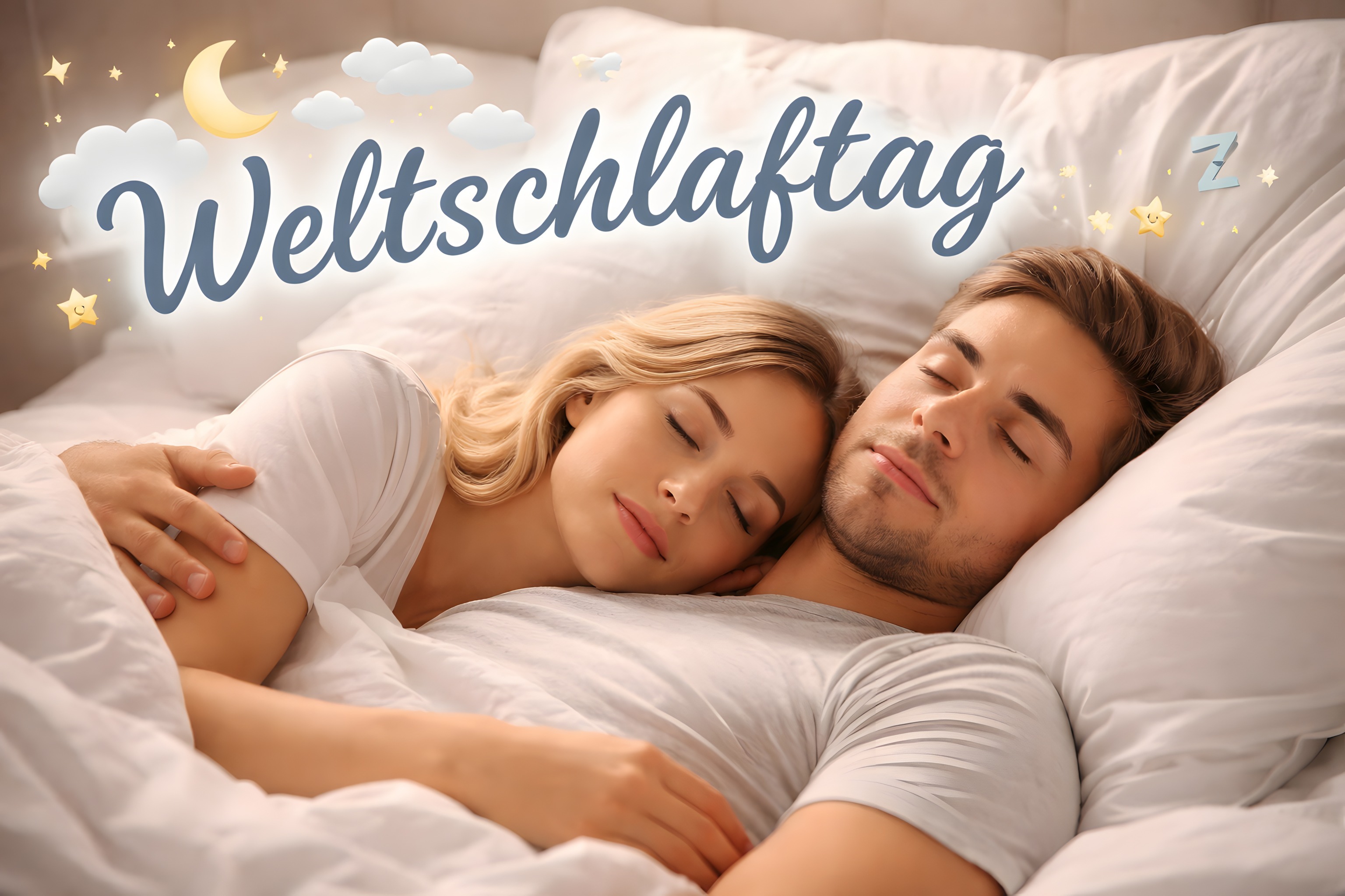 Dieses stimmungsvolle Foto zeigt ein junges Paar, das friedlich und entspannt in einem gemütlichen Bett schläft. Die Szene ist von einer warmen, romantischen Beleuchtung geprägt - der Mond und die Sterne am Nachthimmel verleihen dem Schlafzimmer eine wohlige Atmosphäre. Die Bettwäsche und Kissen sehen einladend und kuschelig aus, sodass man sich in diesem Schlafzimmer sofort geborgen und wohl fühlen kann. Das Foto eignet sich hervorragend als kostenloses Stockfoto für den Einsatz in Blogs, Newslettern, Social-Media-Beiträgen oder Werbematerialien rund um die Themen Erholung, Entspannung und Wellness. Es ist in hoher Auflösung verfügbar und kann unter der Creative-Commons-Lizenz genutzt werden.