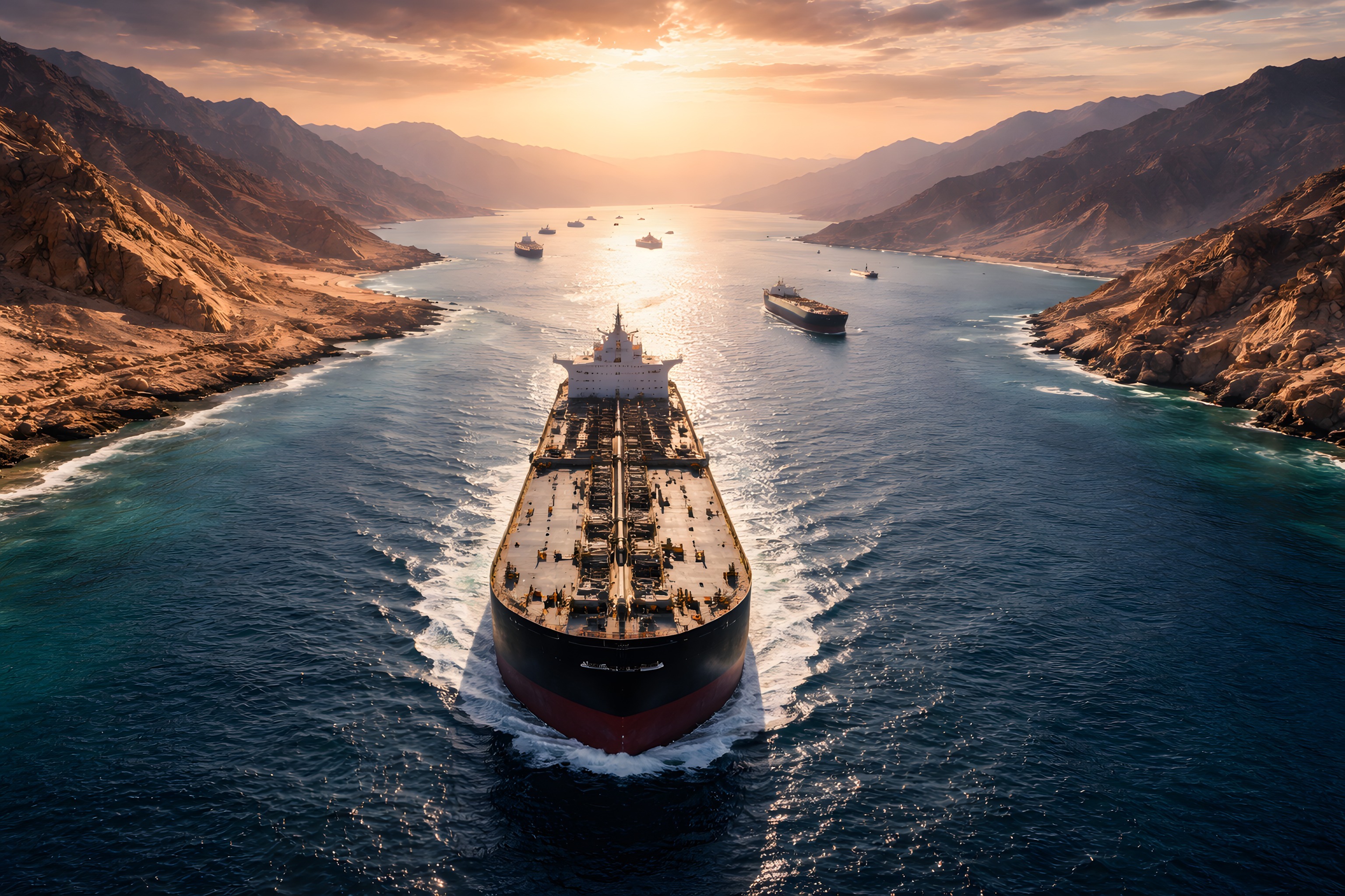 Dieses beeindruckende Luftbild zeigt die belebte Schifffahrtsroute durch die Straße von Hormus im Oman. In der Abenddämmerung laufen mehrere Frachtschiffe und Öltanker durch die von Bergen umgebene Meerenge, deren türkisfarbenes Wasser im warmen Licht der untergehenden Sonne erstrahlt. Die majestätische Landschaft verleiht der Szene eine atemberaubende Atmosphäre. Dieses hochauflösende Stockfoto eignet sich ideal für Verwendung in Blogbeiträgen, Newslettern, Social-Media-Posts oder Werbematerialien zum Thema Schifffahrt, Logistik oder Reise. Es steht unter einer Creative-Commons-Lizenz zur kostenlosen Nutzung zur Verfügung.