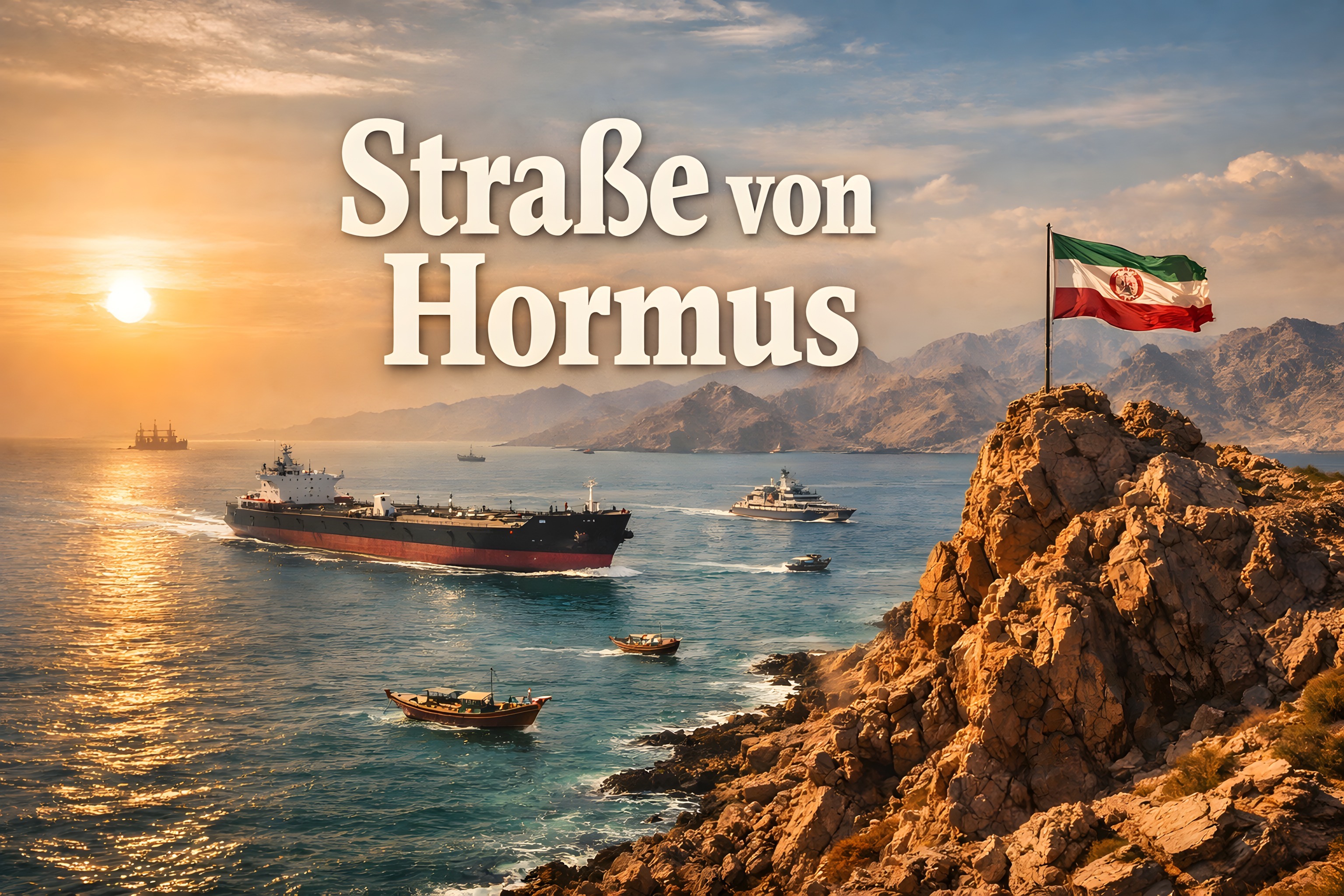 Dieses faszinierende Foto zeigt eine atemberaubende Szene in der Straße von Hormus am Persischen Golf. Im Vordergrund thronen eindrucksvolle Felsformationen, auf denen eine iranische Flagge weht. Im Hintergrund ist der Sonnenuntergang über dem Wasser zu sehen, wo mehrere große Frachtschiffe und Tanker ihre Reise fortsetzen. Das Bild vermittelt einen Eindruck von der majestätischen Natur und der lebendigen Schifffahrt in dieser strategisch wichtigen Meerenge. Als kostenloses Stockfoto in hoher Auflösung und unter Creative-Commons-Lizenz eignet es sich hervorragend für den Einsatz in Blogs, Newslettern, Werbematerialien und auf Social-Media-Kanälen.