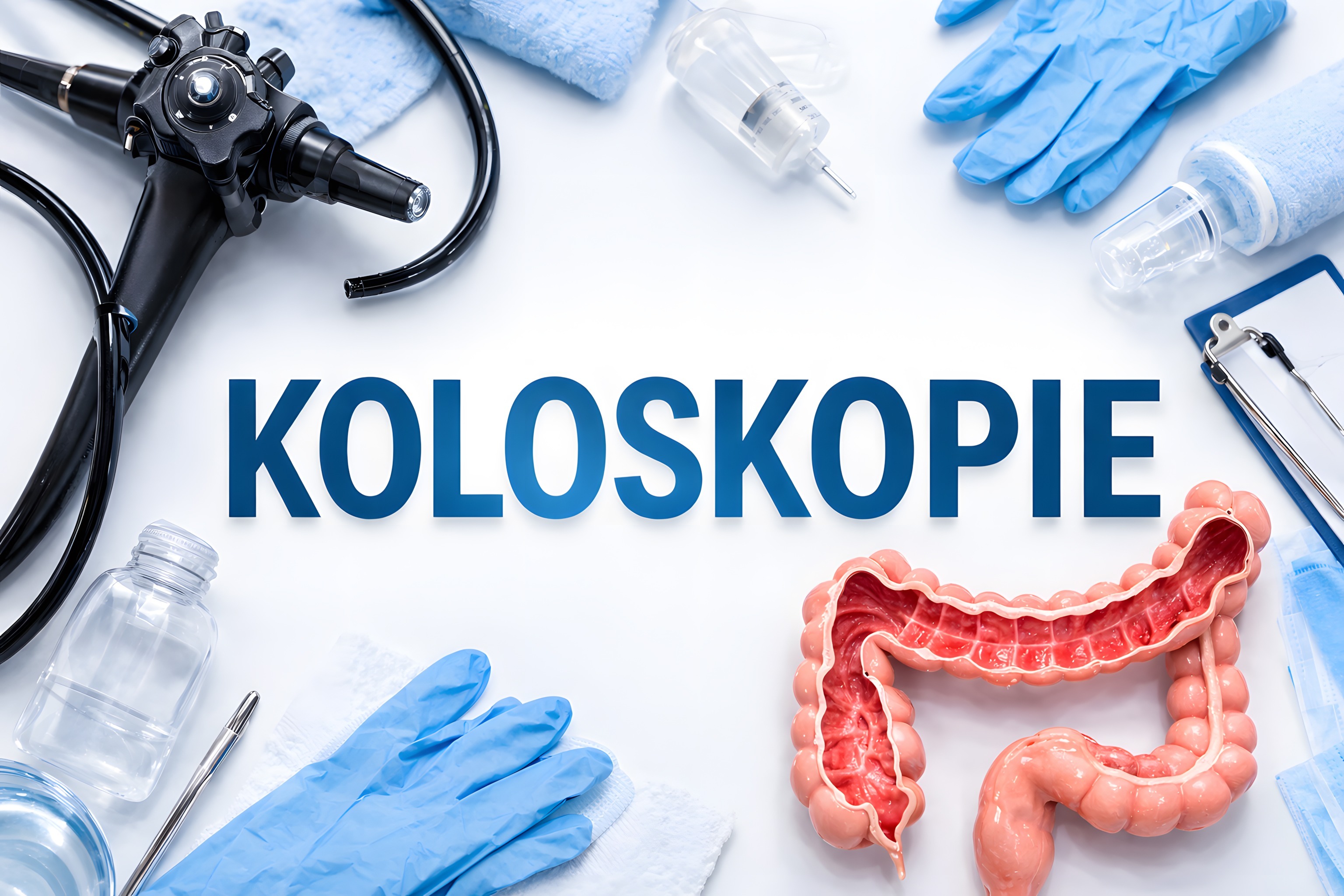 Das Bild zeigt verschiedene medizinische Utensilien, die für eine Koloskopie verwendet werden, eine Untersuchungsmethode zur Früherkennung von Darmkrebs. Im Vordergrund ist ein Darmmodell zu sehen, umgeben von einem Stethoskop, Gummihandschuhen und einer Plastikflasche. Der Hintergrund ist in kühlen Blau- und Weißtönen gehalten, was den professionellen, medizinischen Charakter der Szene unterstreicht.