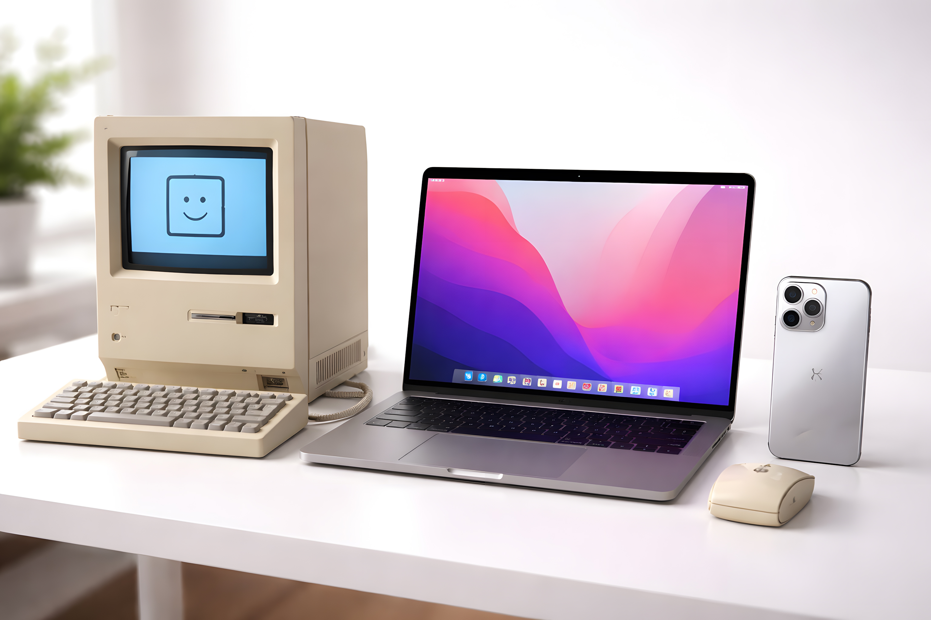 Dieses Foto zeigt einen Arbeitsplatz, der die Vergangenheit und Gegenwart der Technologie miteinander vereint. Auf dem weißen Schreibtisch steht ein älterer Macintosh-Computer mit einem lächelnden Smiley-Icon auf dem Bildschirm. Daneben liegt ein modernes MacBook Pro mit seinem charakteristischen Design und einem bunten Wallpaper. Komplettiert wird der Arbeitsplatz durch ein Smartphone und eine Tastatur.
