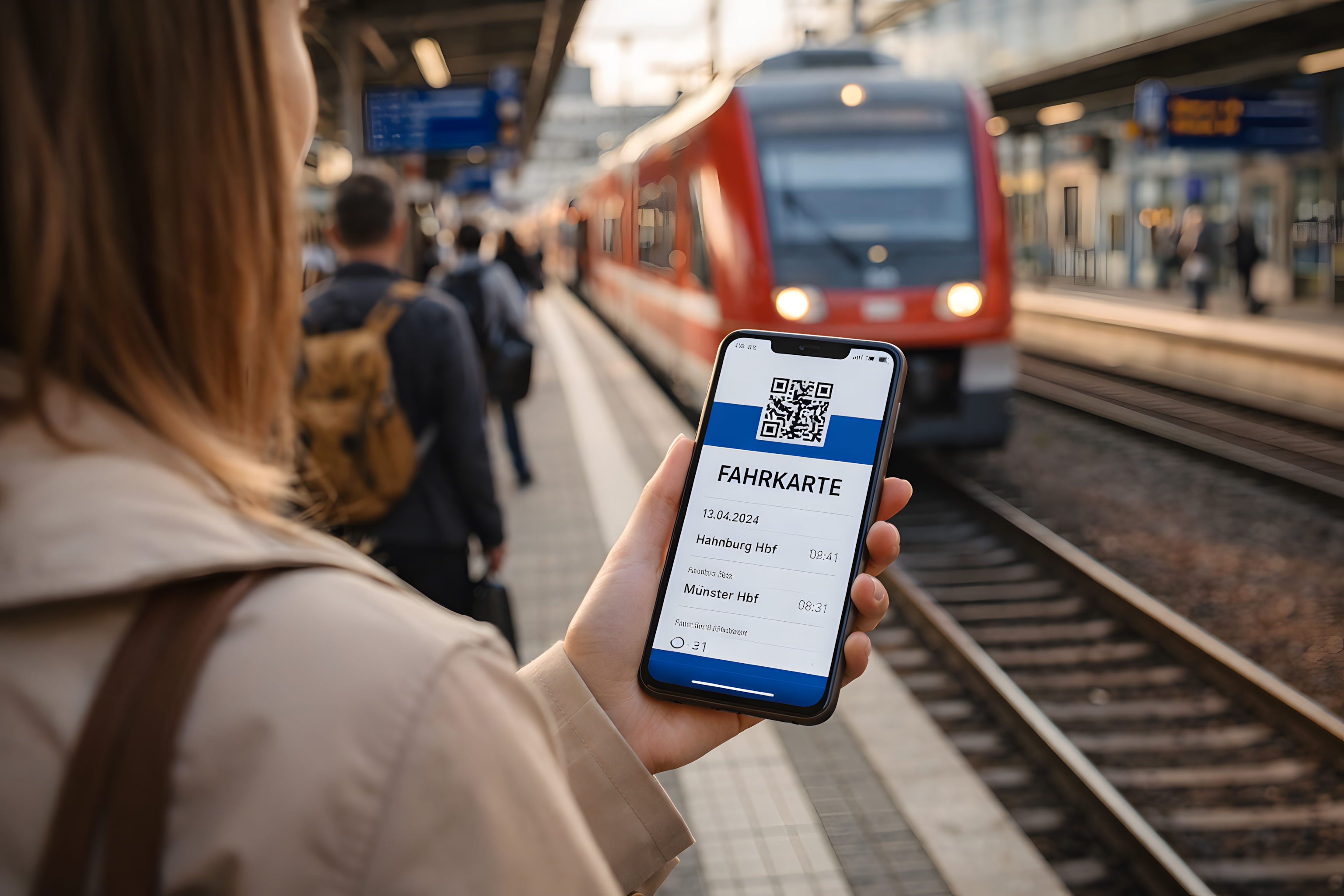 Das Foto zeigt eine Person, die ihr Smartphone in der Hand hält und darauf eine digitale Fahrkarte für den öffentlichen Nahverkehr anzeigt. Im Hintergrund ist ein Bahnsteig zu sehen, an dem ein roter Nahverkehrszug hält. Die Perspektive des Bildes suggeriert, dass die Person sich auf dem Weg zum Zug befindet und ihre Fahrkarte digital auf dem Smartphone abruft, anstatt eine physische Karte zu verwenden. Das Foto illustriert den Trend zur Digitalisierung im Bereich des öffentlichen Personennahverkehrs und zeigt, wie moderne Technologien wie Smartphones und Apps das Reisen erleichtern und effizienter gestalten können. Das Bild eignet sich hervorragend für den Einsatz in Blogbeiträgen, Social-Media-Posts oder Präsentationen zum Thema Mobilität, Digitalisierung und zukunftsorientierter Infrastruktur.