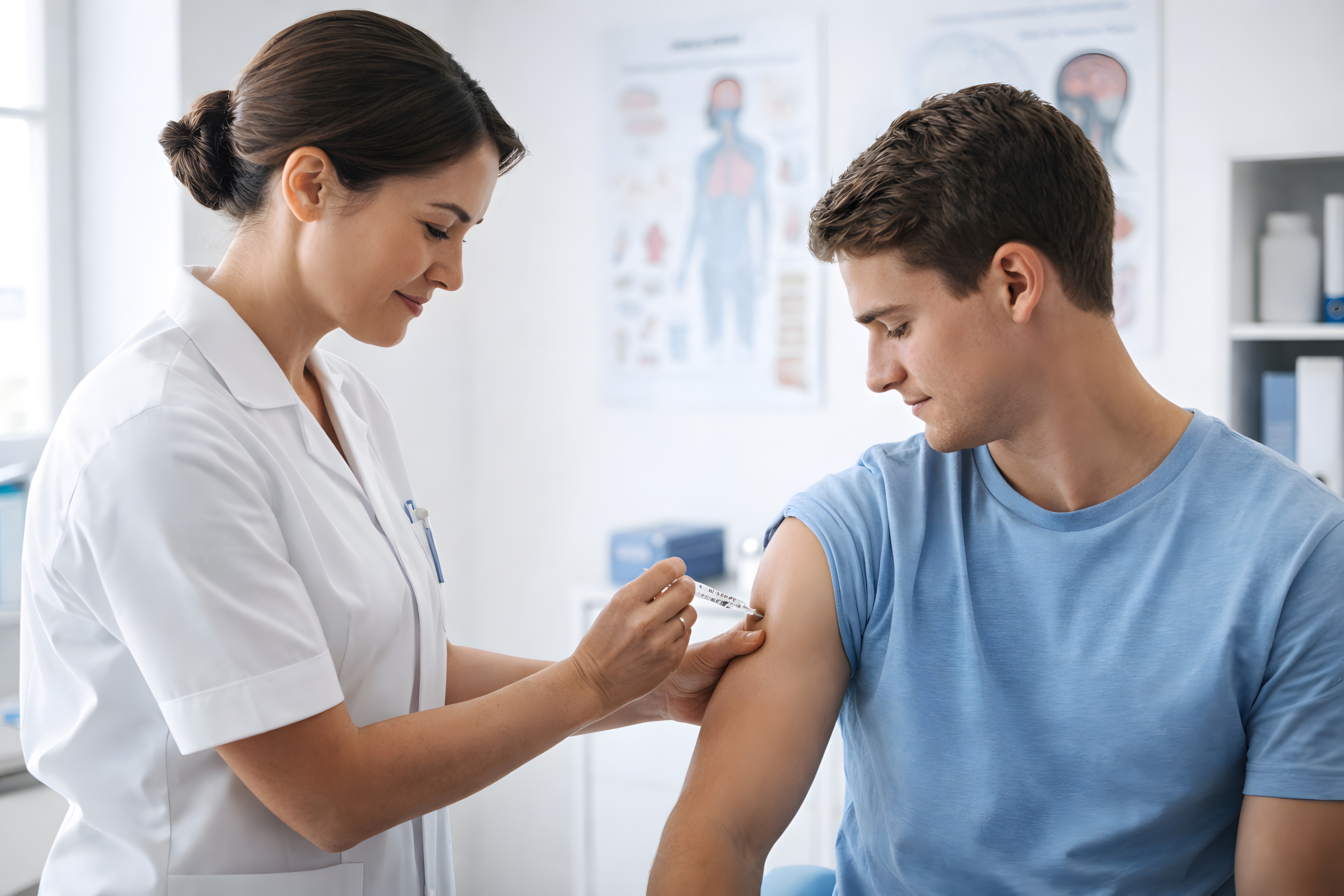 Das Bild zeigt eine Krankenschwester, die einem jungen Patienten eine Impfung in den Arm verabreicht. Die Krankenschwester trägt eine weiße Uniform und hält eine Spritze in der Hand, während der Patient sitzend auf einem Behandlungsstuhl in einem Büroraum mit medizinischen Infografiken an den Wänden zu sehen ist.
