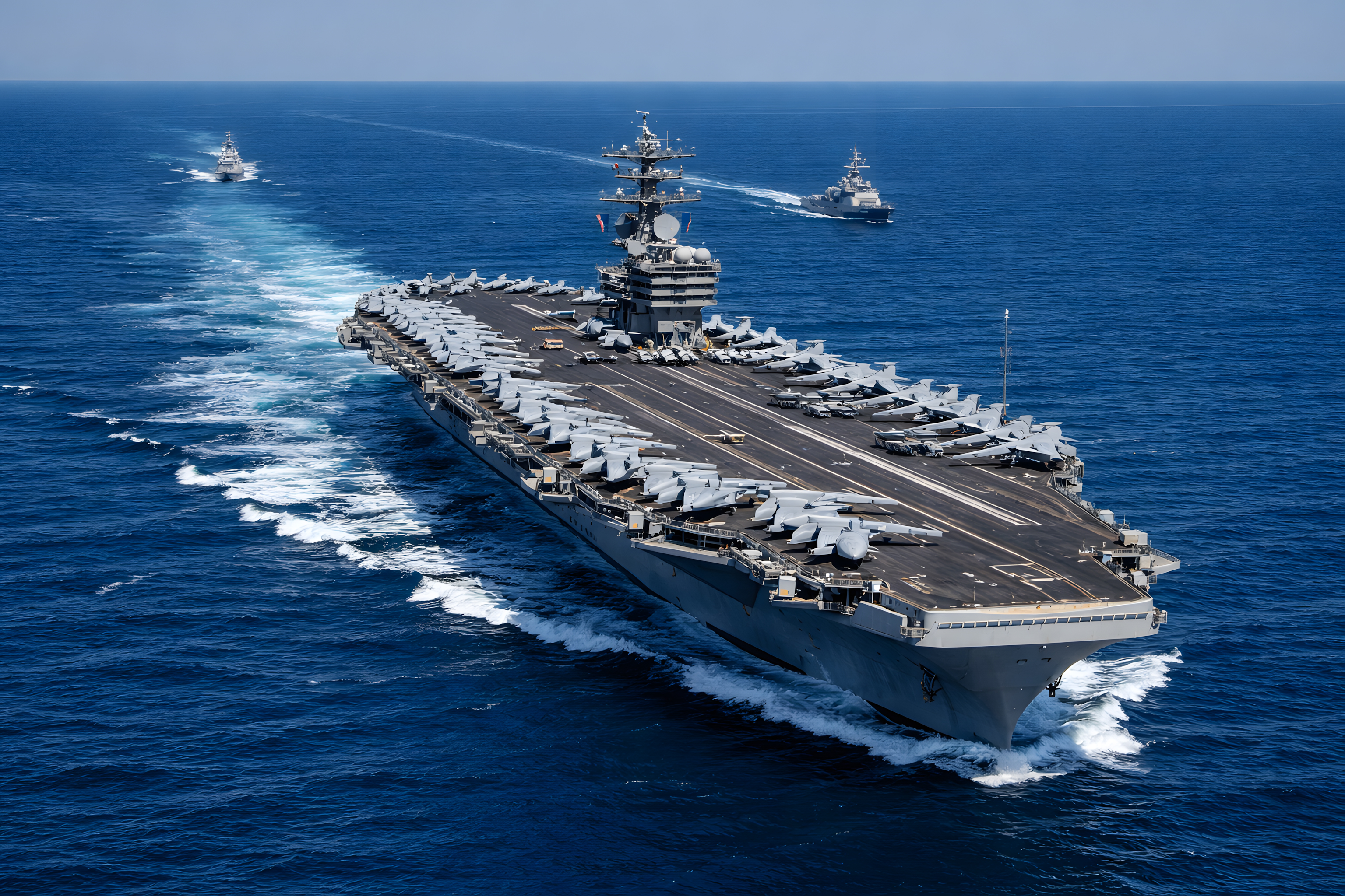 Dieses beeindruckende Luftbild zeigt eine Gruppe mächtiger Flugzeugträger und Begleitschiffe, die mit hoher Geschwindigkeit über den tiefblauen Ozean gleiten. Die Träger mit ihren riesigen Flugdecks bilden das Herzstück dieser imposanten Kriegsflotte, die eine enorme Feuerkraft und Reichweite verkörpert. Die Schiffe scheinen perfekt koordiniert zu agieren, was auf eine hocheffiziente Führung und Logistik hindeutet. Dieses Foto vermittelt eindrucksvoll die Stärke und Präsenz dieser maritimen Militärmacht, die für Schutz und Sicherheit in internationalen Gewässern sorgt. Es eignet sich hervorragend als Illustration für Berichte über Verteidigungspolitik, Militärstrategien oder die Rolle der Marine in der Geopolitik. Auch in Präsentationen zu Themen wie Technik, Logistik oder Kommunikation in Großorganisationen könnte dieses Bild effektvoll eingesetzt werden.
