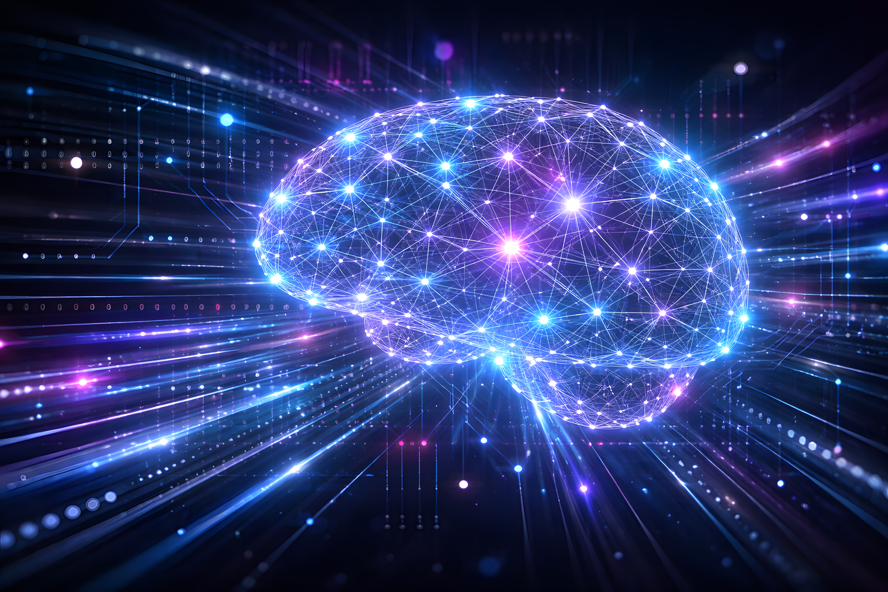 Dieses digitale Kunstwerk visualisiert die faszinierende Welt künstlicher neuronaler Netzwerke. Es zeigt eine leuchtende, vernetzte Gehirnstruktur, die an die Komplexität und Intelligenz des menschlichen Gehirns erinnert. Die Perspektive lässt den Betrachter eintauchen in eine Welt der Kognition, Kreativität und digitalen Technologie. Die Farbgebung in Blautönen, durchzogen von hellen Leuchtpunkten, erzeugt eine energetische, zukunftsweisende Atmosphäre.