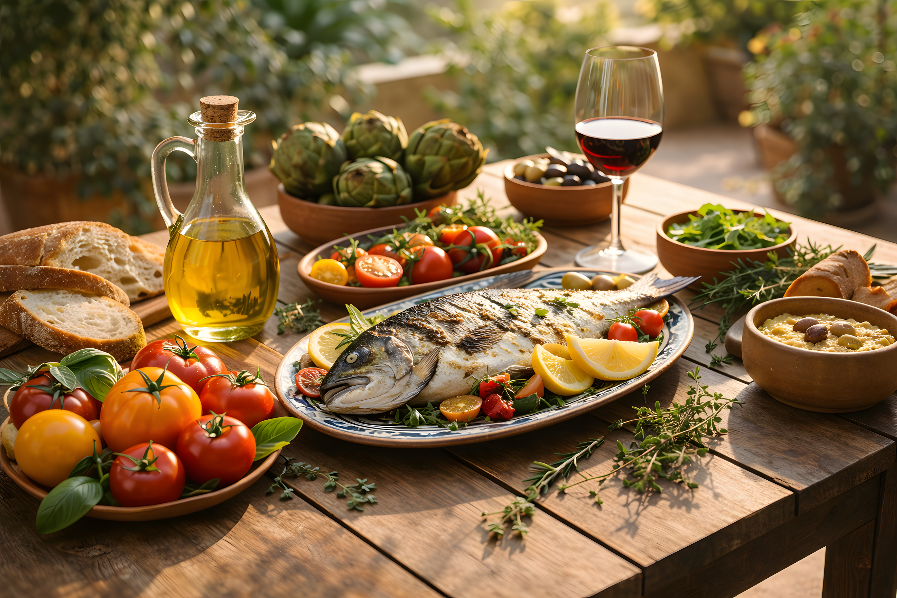Dieses Foto zeigt ein einladendes mediterranes Abendessen, das auf einem rustikalen Holztisch angerichtet ist. Im Mittelpunkt befindet sich ein frisch gegrillter Fisch, umgeben von saisonalem Gemüse wie Tomaten, Artischocken und grünen Blattsalaten. Dazu gibt es Brotscheiben, ein Glas Rotwein sowie ein Kruzifix mit Olivenöl.
