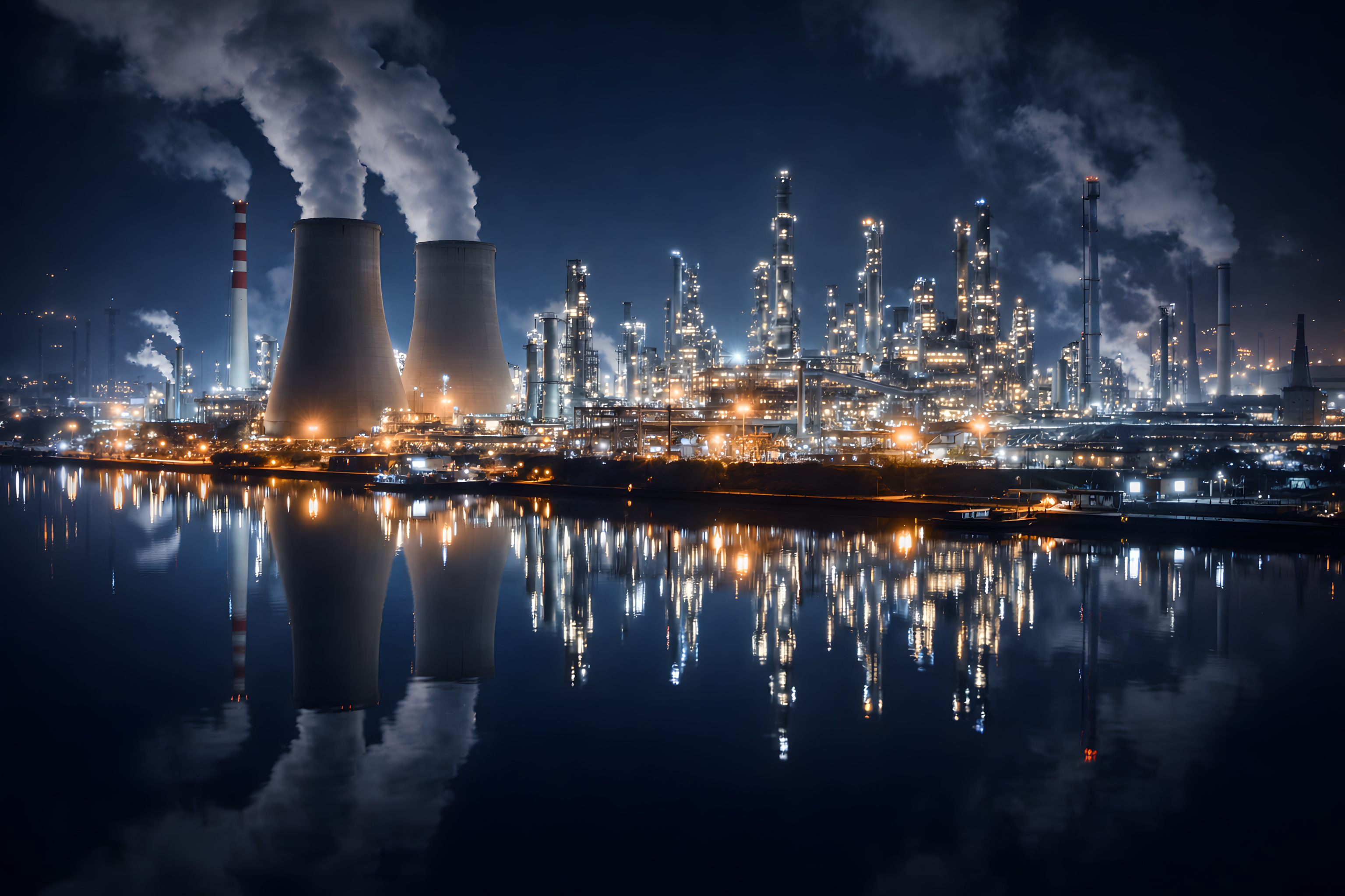 Diese beeindruckende Aufnahme zeigt eine gigantische Industrieanlage bei Nacht. Die Silhouette einer modernen Raffinerie-Skyline mit ihren markanten Kühltürmen und Schornsteinen spiegelt sich in den ruhigen Gewässern vor der Anlage wider. Das Bild ist voller industrieller Symbolik und Kontraste - die majestätischen Hochhäuser, die riesigen Kühltürme und die zahlreichen Rauchfahnen verleihen der Szene eine bedrohliche, aber zugleich faszinierende Ästhetik.
