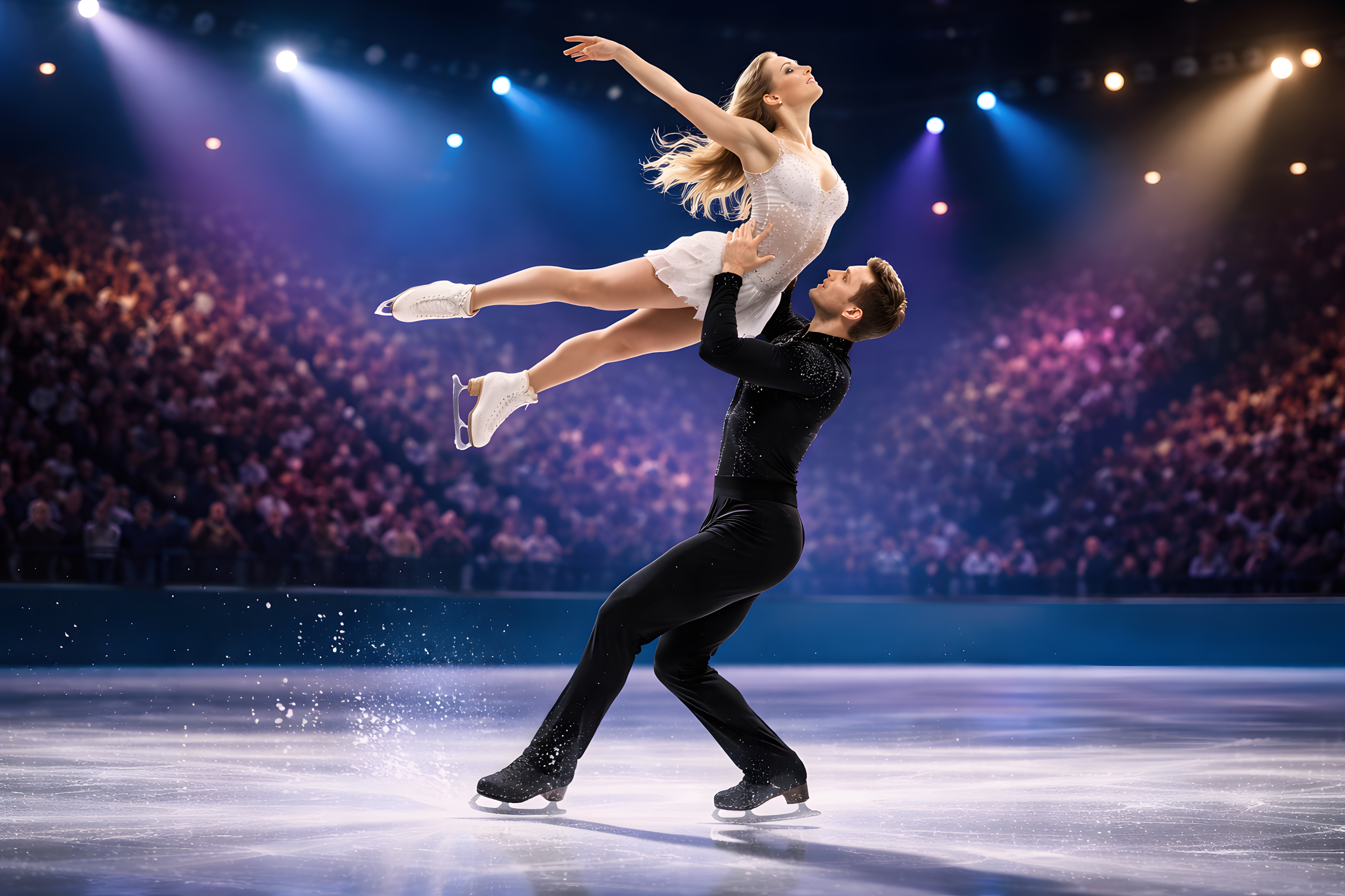Das Foto zeigt ein elegantes Eiskunstlauf-Paar in einer dynamischen Bewegung auf der Bühne. Die Tänzerin schwebt in einer anmutigen Haltung in den Armen ihres Partners, der sie sicher und kraftvoll unterstützt. Die beiden wirken voller Anmut und Leichtigkeit, was durch die geschmeidigen Bewegungen und perfekt aufeinander abgestimmte Choreographie zum Ausdruck kommt. Die bunte Beleuchtung und das begeisterte Publikm im Hintergrund verleihen der Szene eine festliche Atmosphäre eines Eiskunstlaufwettbewerbs oder einer Aufführung. Dieses Bild eignet sich hervorragend für die Verwendung in Blogbeiträgen, Newslettern oder Social-Media-Posts rund um das Thema Eiskunstlauf, Tanz, Athletik und Eleganz. Die dynamische Komposition und die strahlenden Farben machen es zu einem spannenden Eyecatcher, der Leser und Betrachter in ihren Bann zieht.