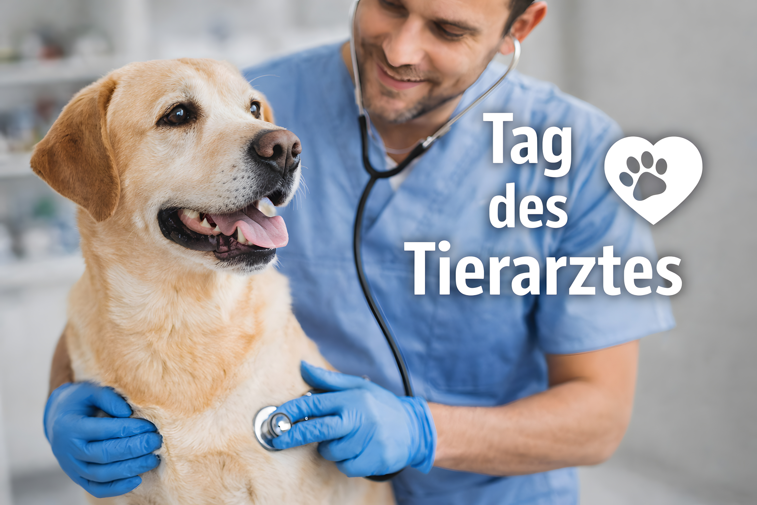 Das Bild zeigt einen freundlichen, lächelnden Tierarzt, der einen Labrador-Hund sorgfältig mit seinem Stethoskop untersucht. Der Tierarzt trägt eine blaue Uniformjacke und Gummihandschuhe, was auf die professionelle medizinische Umgebung einer Tierklinik oder Praxis hinweist. Der Hund sitzt entspannt und vertrauensvoll vor dem Tierarzt, was die gute Beziehung zwischen Mensch und Tier widerspiegelt.