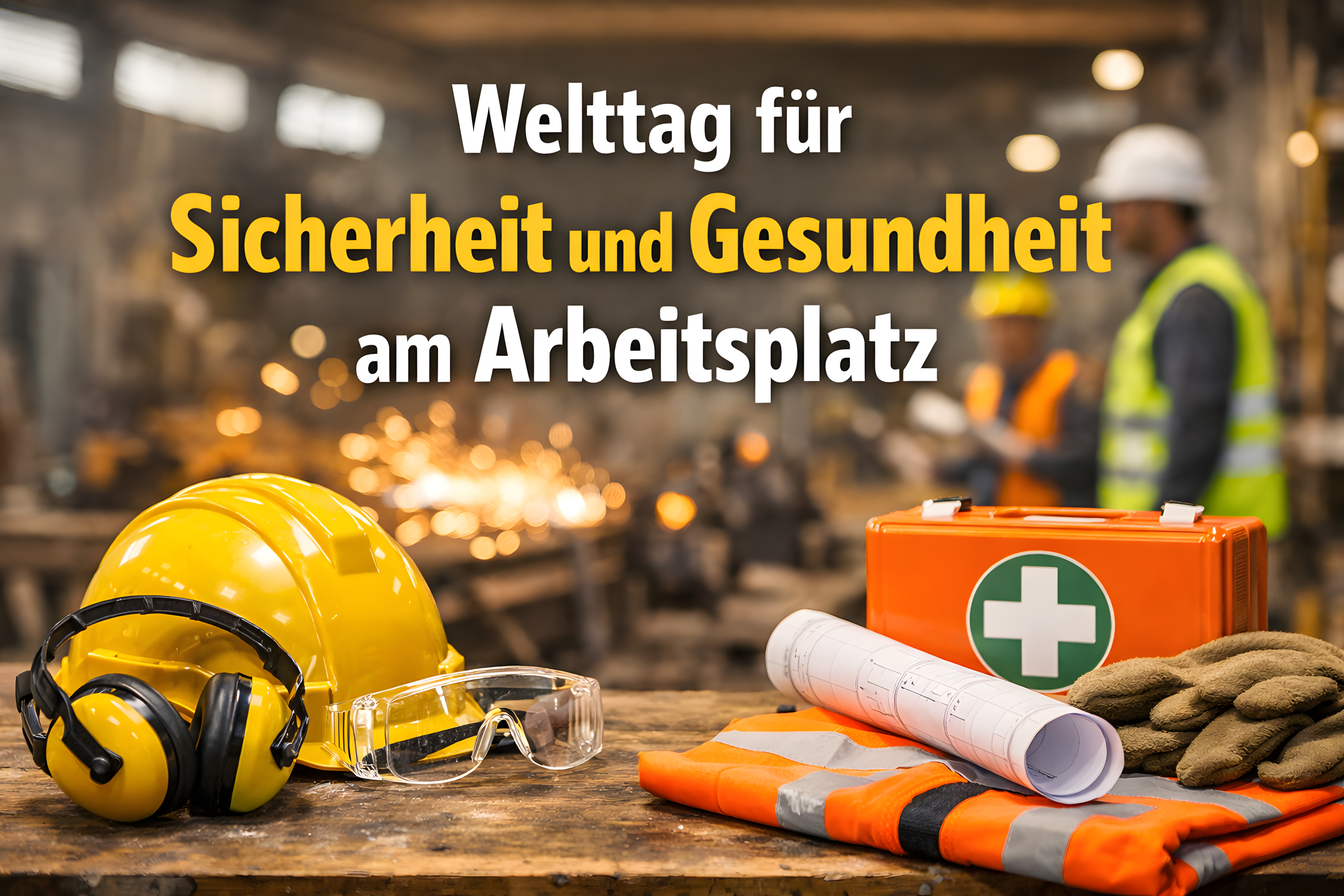 Der Titel "Welttag für Sicherheit und Gesundheit am Arbeitsplatz" deutet darauf hin, dass dieses Bild für Informationskampagnen oder Veranstaltungen zum Thema Arbeitssicherheit und -gesundheit verwendet werden könnte. Die dargestellten Elemente wie Schutzhelm, Schutzbrillen, Handschuhe und ein Erste-Hilfe-Kasten sind typische Hilfsmittel, um die Sicherheit und das Wohlbefinden von Arbeitnehmern zu gewährleisten.