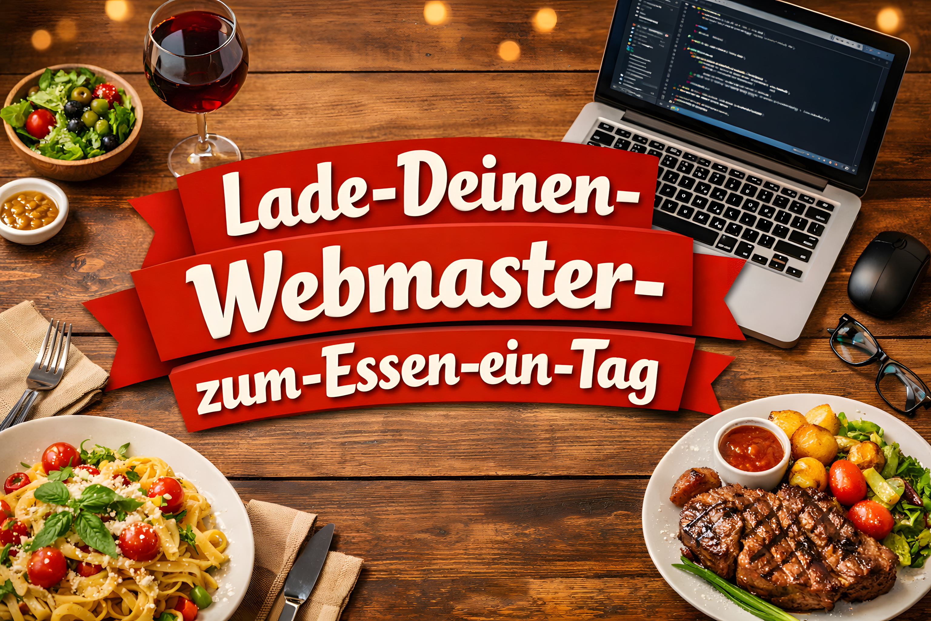 Das Foto zeigt eine genussvolle Mahlzeit, die mit der professionellen Entwicklung von Webseiten kontrastiert wird. Im Vordergrund sind ein Teller mit einem Steak, Kartoffeln, Salat und Gemüse sowie ein Glas Rotwein zu sehen. Im Hintergrund befindet sich ein Laptop mit Programmiercodes auf dem Bildschirm. Die Kombination aus gutem Essen und effizienter Webentwicklung soll die Vielseitigkeit des Webmasters veranschaulichen, der sowohl für das leibliche als auch für das digitale Wohl seiner Kunden sorgt.