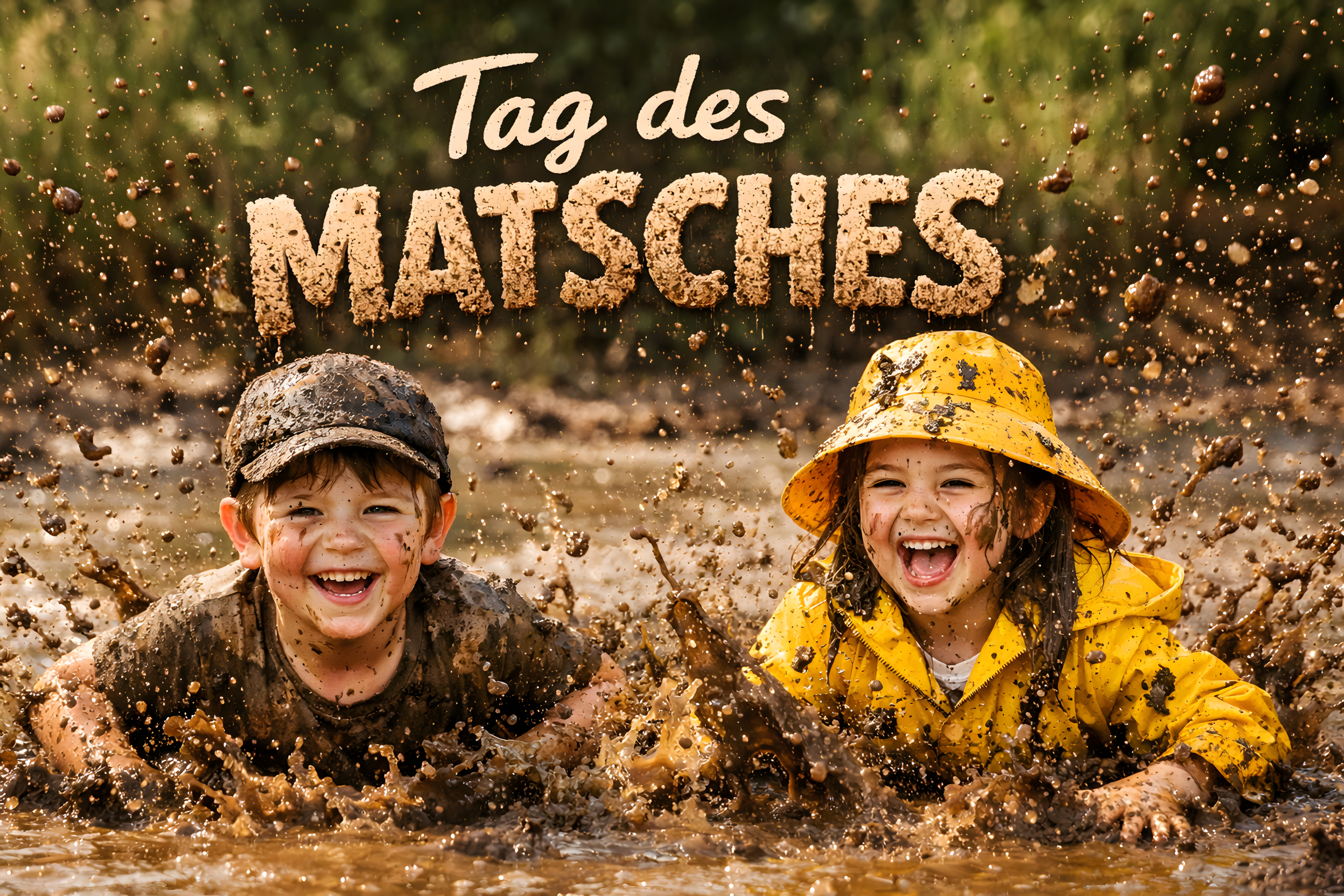 Das Foto zeigt zwei glückliche Kinder, die sich fröhlich im Matsch suhlen. Sie tragen bunte Regenbekleidung und lachen herzhaft, während sie mit ihren Händen und Füßen den Schlamm aufwirbeln. Ihre Gesichter und Kleider sind bereits von Erde bedeckt, aber das scheint ihnen nichts auszumachen - stattdessen genießen sie sichtlich den Spaß und das Naturerlebnis.